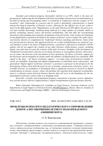 7. Смушкин А. Б., Савельева М. В., Потапова Н. Л. Перспективные направления разработки и реализации криминалистических инноваций // Электронное приложение к “Российскому юридическому журналу”. 2021 № 3. С. 50-58. DOI: 10.34076/22196838_2021_3_50 EDN: MVACYQ