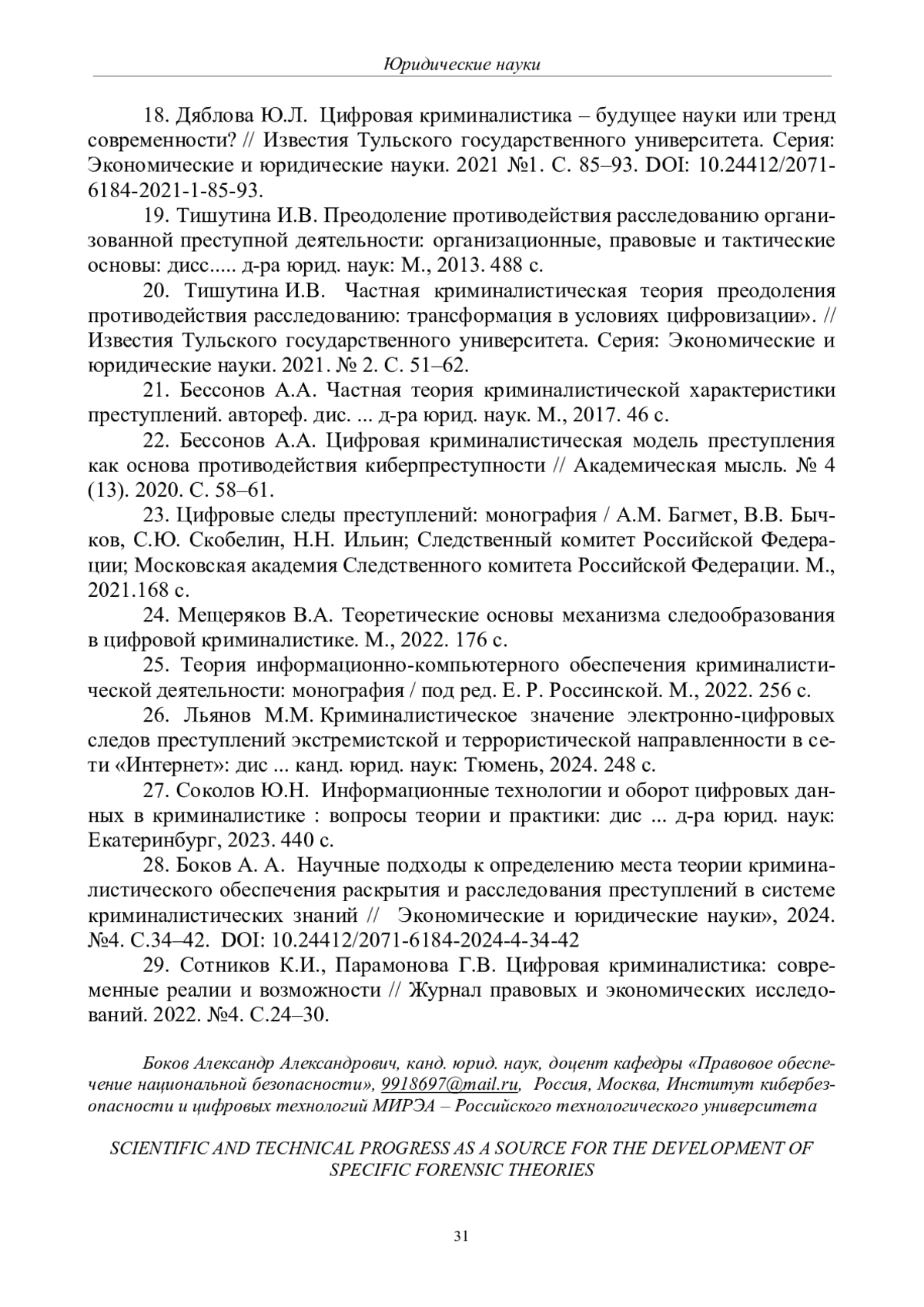 20. Тишутина И.В. Частная криминалистическая теория преодоления противодействия расследованию: трансформация в условиях цифровизации“. // Известия Тульского государственного университета. Серия: Экономические и юридические науки. 2021. № 2. С. 51-62. EDN: RGZFTB