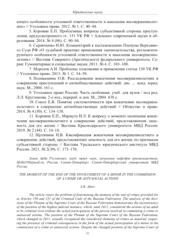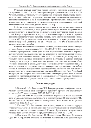 11. Коровин Е.П., Мармута И.Л. К вопросу о моменте окончания вовлечения несовершеннолетнего в совершение действий, представляющих опасность для его жизни // Вестник Краснодарского университета МВД России. 2019. № 2 (44). С. 14-18. EDN: NZCGXR