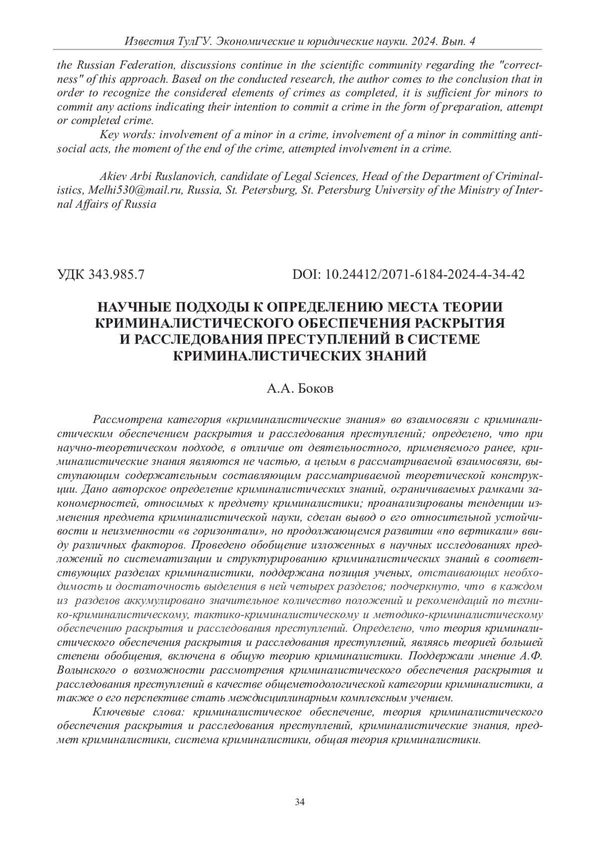 Рассмотрена категория «криминалистические знания» во взаимосвязи с криминалистическим обеспечением раскрытия и расследования преступлений; определено, что при научно - теоретическом подходе, в отличие от деятельностного, применяемого ранее, криминалистические знания являются не частью, а целым в рассматриваемой взаимосвязи, выступающим содержательным составляющим рассматриваемой теоретической конструкции. Дано авторское определение криминалистических знаний, ограничиваемых рамками закономерностей, относимых к предмету криминалистики; проанализированы тенденции изменения предмета криминалистической науки, сделан вывод о его относительной устойчивости и неизменности «в горизонтали», но продолжающемся развитии «по вертикали» ввиду различных факторов. Проведено обобщение изложенных в научных исследованиях предложений по систематизации и структурированию криминалистических знаний в соответствующих разделах криминалистики, поддержана позиция ученых, отстаивающих необходимость и достаточность выделения в ней четырех разделов; подчеркнуто, что в каждом из разделов аккумулировано значительное количество положений и рекомендаций по технико - криминалистическому, тактико - криминалистическому и методико - криминалистическому обеспечению раскрытия и расследования преступлений. Определено, что теория криминалистического обеспечения раскрытия и расследования преступлений, являясь теорией большей степени обобщения, включена в общую теорию криминалистики. Поддержали мнение А. Ф. Волынского о возможности рассмотрения криминалистического обеспечения раскрытия и расследования преступлений в качестве общеметодологической категории криминалистики, а также о его перспективе стать междисциплинарным комплексным учением.