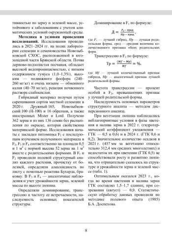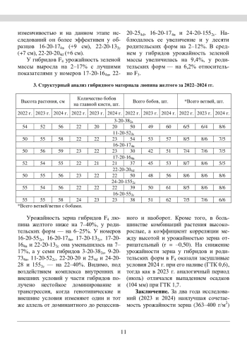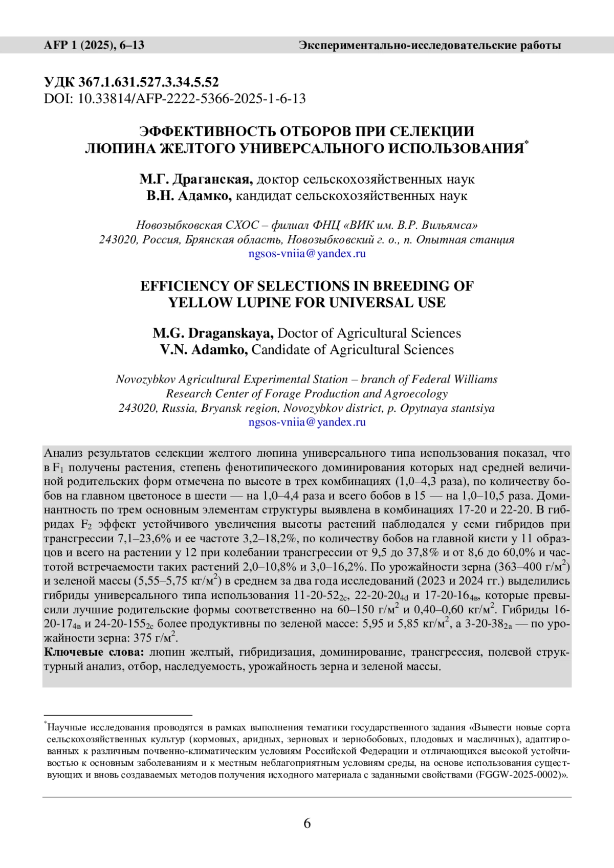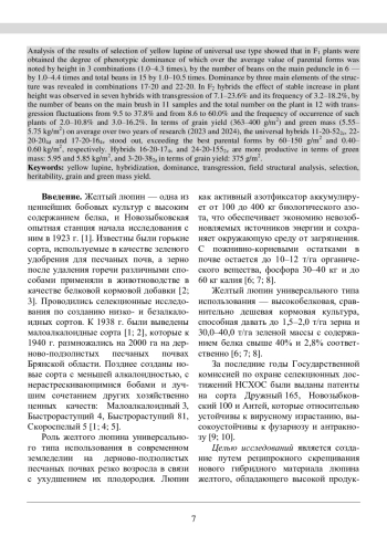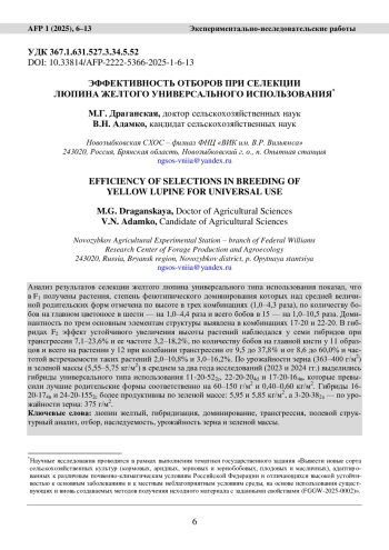 Анализ результатов селекции желтого люпина универсального типа использования показал, что в F1 получены растения, степень фенотипического доминирования которых над средней величи-ной родительских форм отмечена по высоте в трех комбинациях (1,0–4,3 раза), по количеству бо-бов на главном цветоносе в шести — на 1,0–4,4 раза и всего бобов в 15 — на 1,0–10,5 раза. Доми-нантность по трем основным элементам структуры выявлена в комбинациях 17-20 и 22-20. В гиб-ридах F2 эффект устойчивого увеличения высоты растений наблюдался у семи гибридов при трансгрессии 7,1–23,6% и ее частоте 3,2–18,2%, по количеству бобов на главной кисти у 11 образ-цов и всего на растении у 12 при колебании трансгрессии от 9,5 до 37,8% и от 8,6 до 60,0% и час-тотой встречаемости таких растений 2,0–10,8% и 3,0–16,2%. По урожайности зерна (363–400 г/м2) и зеленой массы (5,55–5,75 кг/м2) в среднем за два года исследований (2023 и 2024 гг.) выделились гибриды универсального типа использования 11-20-522с, 22-20-204d и 17-20-164в, которые превы-сили лучшие родительские формы соответственно на 60–150 г/м2 и 0,40–0,60 кг/м2. Гибриды 16-20-174в и 24-20-1552с более продуктивны по зеленой массе: 5,95 и 5,85 кг/м2, а 3-20-382а — по уро-жайности зерна: 375 г/м2.
