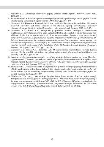 6. Лихачев Б.С., Новик Н.В. Биологический потенциал люпина желтого и возможности селекционного повышения уровня его реализации // Люпин - его возможности и перспективы: Материалы Международной научно-практической конференции, посвященной 25-летию со дня основания Всероссийского научно-исследовательского института люпина. - Брянск: Читай-город, 2012. - С. 119-125.