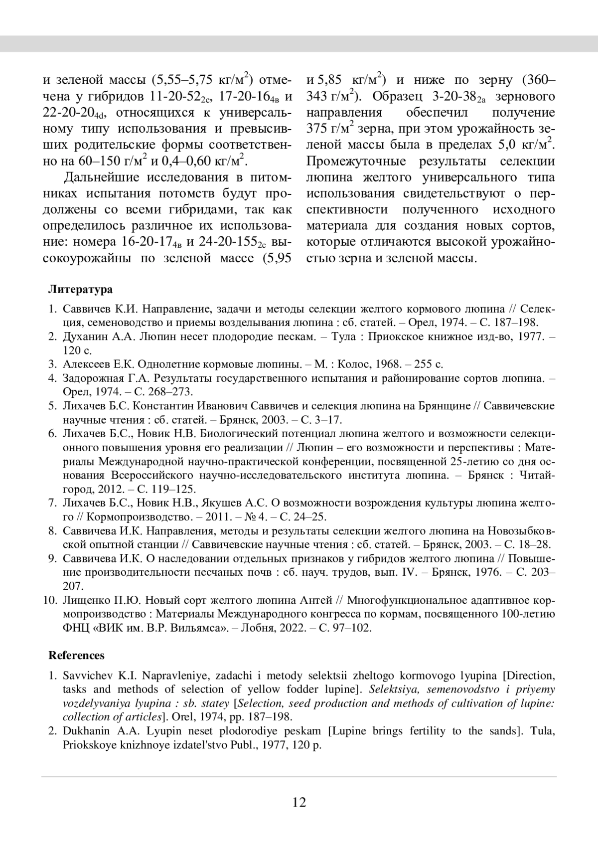 10. Лищенко П.Ю. Новый сорт желтого люпина Антей // Многофункциональное адаптивное кормопроизводство: Материалы Международного конгресса по кормам, посвященного 100-летию ФНЦ “ВИК им. В.Р. Вильямса”. - Лобня, 2022. - С. 97-102.