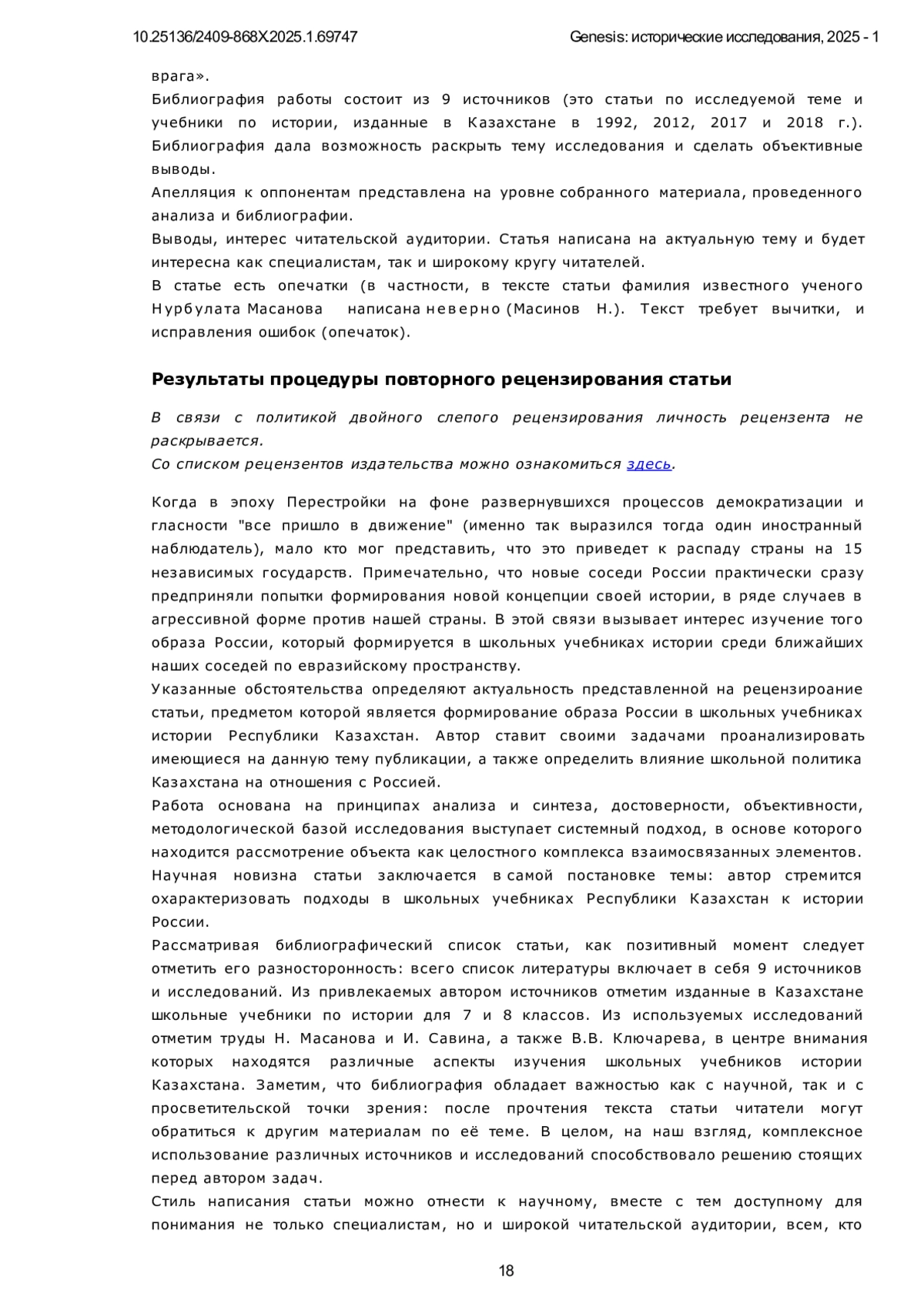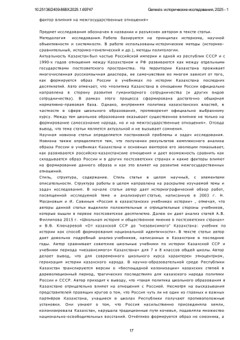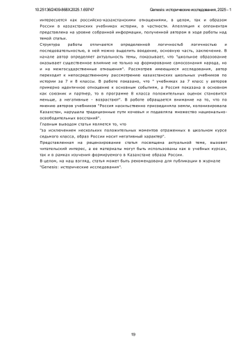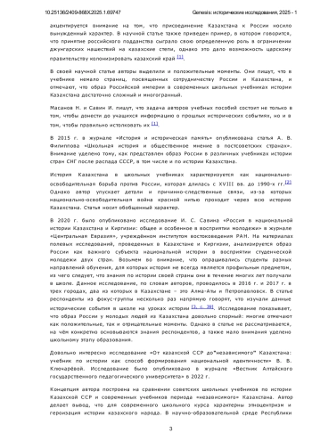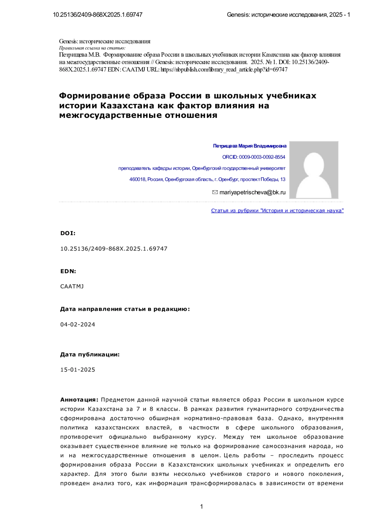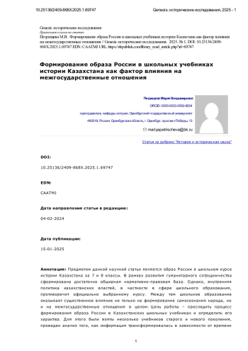 ПЕТРИЩЕВА М. В. ФОРМИРОВАНИЕ ОБРАЗА РОССИИ В ШКОЛЬНЫХ УЧЕБНИКАХ ИСТОРИИ КАЗАХСТАНА КАК ФАКТОР ВЛИЯНИЯ НА МЕЖГОСУДАРСТВЕННЫЕ ОТНОШЕНИЯ // GENESIS: ИСТОРИЧЕСКИЕ ИССЛЕДОВАНИЯ. 2025. № 1