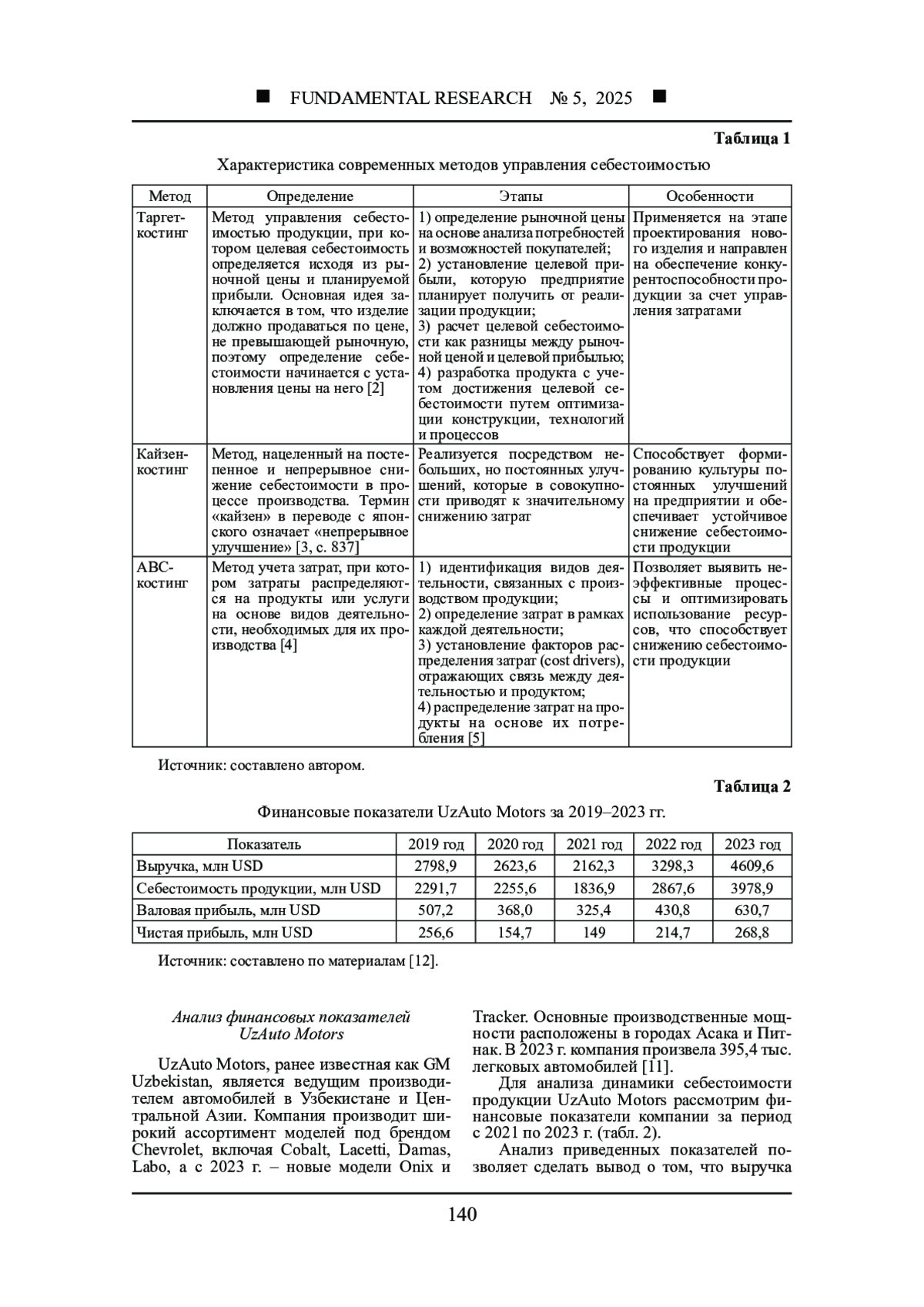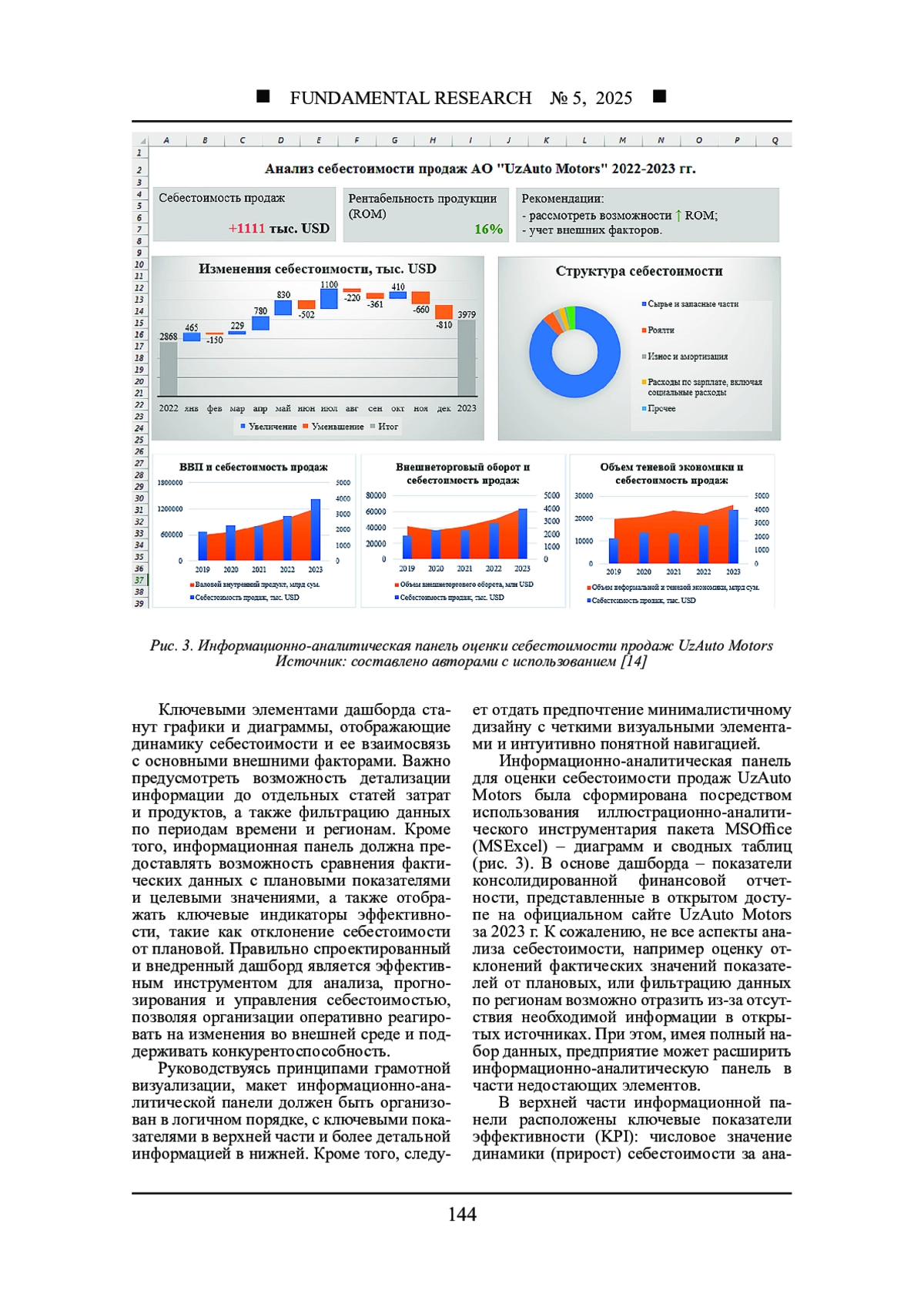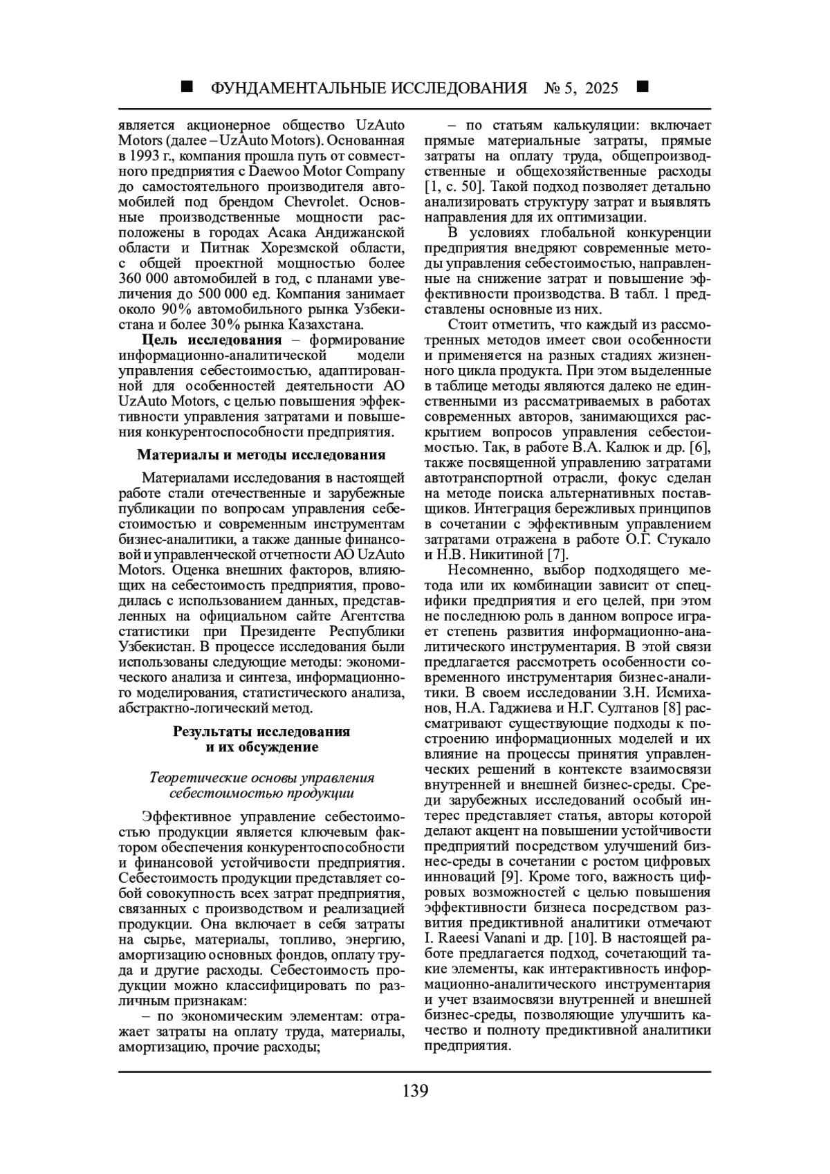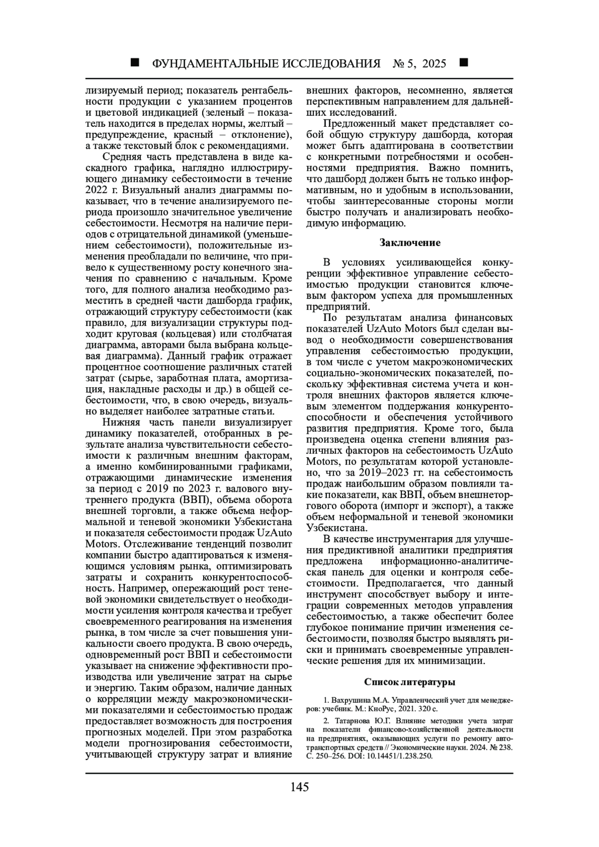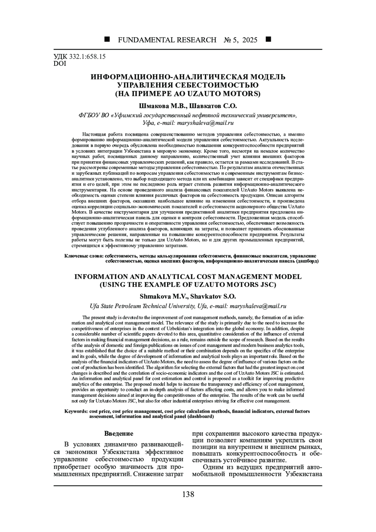 Настоящая работа посвящена совершенствованию методов управления себестоимостью, а именно формированию информационно-аналитической модели управления себестоимостью. Актуальность исследования в первую очередь обусловлена необходимостью повышения конкурентоспособности предприятий в условиях интеграции Узбекистана в мировую экономику. Кроме того, несмотря на немалое количество научных работ, посвященных данному направлению, количественный учет влияния внешних факторов при принятии финансовых управленческих решений, как правило, остается за рамками исследований. В статье рассмотрены современные методы управления себестоимостью. По результатам анализа отечественных и зарубежных публикаций по вопросам управления себестоимостью и современным инструментам бизнес-аналитики установлено, что выбор подходящего метода или их комбинации зависит от специфики предприятия и его целей, при этом не последнюю роль играет степень развития информационно-аналитического инструментария. На основе проведенного анализа финансовых показателей UzAuto Motors выявлена необходимость оценки степени влияния различных факторов на себестоимость продукции. Описан алгоритм отбора внешних факторов, оказавших наибольшее влияние на изменения себестоимости, и произведена оценка корреляции социально-экономических показателей и себестоимости акционерного общества UzAuto Motors. В качестве инструментария для улучшения предиктивной аналитики предприятия предложена информационно-аналитическая панель для оценки и контроля себестоимости. Предложенная модель способствует повышению прозрачности и оперативности управления себестоимостью, обеспечивает возможность проведения углубленного анализа факторов, влияющих на затраты, и позволяет принимать обоснованные управленческие решения, направленные на повышение конкурентоспособности предприятия. Результаты работы могут быть полезны не только для UzAuto Motors, но и для других промышленных предприятий, стремящихся к эффективному управлению затратами.