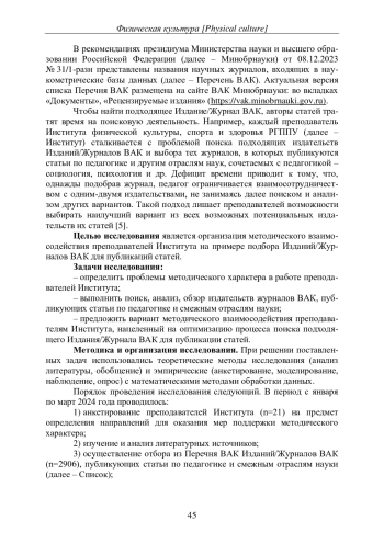 Одним из требований к претендентам, участвующим в конкурсе на замещение должностей профессорско-преподавательского состава, согласно приказу Федерального государственного автономного образовательного учреждения высшего образования «Российский государственный профессионально-педагогический университет» (далее – РГППУ) № 382-1 от 03.06.2022, является наличие публикаций в изданиях, индексируемых в библиографических зарубежных базах данных и/или в RSCI (Russian Science Citation Index), а также в журналах из списка Высшей аттестационной комиссии при Министерстве науки и высшего образования Российской Федерации (ВАК) (далее – Издание/Журнал ВАК) за последние 3 года: от ассистентов требуется не менее одной научной статьи, от профессоров – не менее восьми.