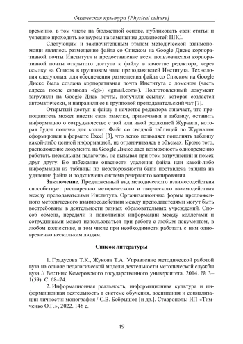 1. Градусова Т.К., Жукова Т.А. Управление методической работой вуза на основе педагогической модели деятельности методической службы вуза // Вестник Кемеровского государственного университета. 2014. № 3-1(59). С. 68-74.