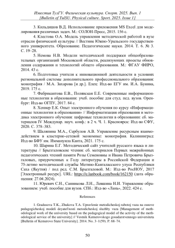 4. Клестова О.А. Модель управления методической работой в вузе отрасли физической культуры // Вестник Южно-Уральского государственного университета. Образование. Педагогические науки. 2014. Т. 6. № 3. С. 19-28. EDN: SMOCIP