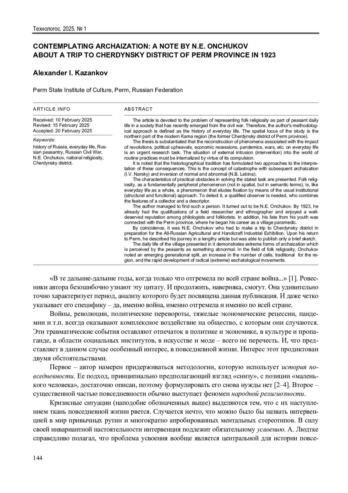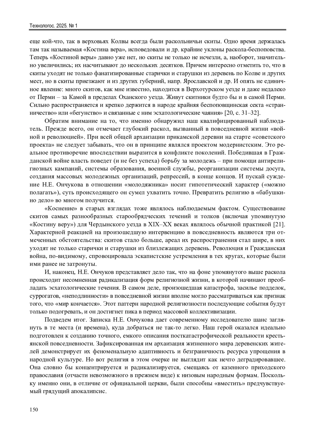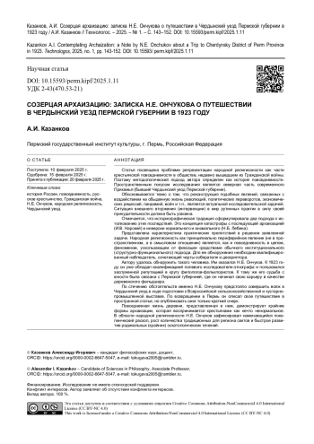 Статья посвящена проблеме репрезентации народной религиозности как части крестьянской повседневности в обществе, недавно вышедшем из Гражданской войны. Поэтому методологический подход автора определен как история повседневности. Пространственным локусом исследования является северная часть современного Прикамья (бывший Чердынский уезд Пермской губернии).
