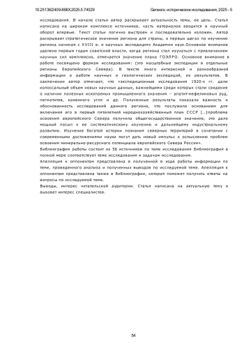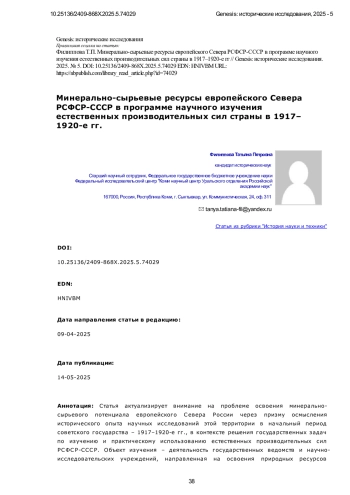 Статья актуализирует внимание на проблеме освоения минерально-сырьевого потенциала европейского Севера России через призму осмысления исторического опыта научных исследований этой территории в начальный период советского государства - 1917-1920-е гг., в контексте решения государственных задач по изучению и практическому использованию естественных производительных сил РСФСР-СССР. Объект изучения - деятельность государственных ведомств и научно-исследовательских учреждений, направленная на освоения природных ресурсов европейского Севера страны. Предмет исследования - историческая роль науки в изучении минерально-сырьевых ресурсов европейского Севера страны и получение результатов для дальнейшего индустриального развития этого региона. Основа исследования - документы фондов Российского государственного исторического архива, Арктического и Антарктического научно-исследовательского института, Центрального государственного архива научно-технической документации г. Санкт-Петербурга, Санкт-Петербургского филиала Архива Российской академии наук, Национального архива Республики Коми, часть из них вводится в научный оборот впервые. Одну из составляющих источниковой базы работы составили опубликованные законодательные акты, характеризующие деятельность советского правительства, а также научные труды ученых. Методологической основой исследования стали принципы современной исторической науки: историзм и научная объективность. Примененный системный подход позволил создать объективную историческую реконструкцию событий, связанных с изучением минерально-сырьевых ресурсов европейского Севера в обозначенный временной период. Определено, что после 1917 г. европейский Север находился в зоне особых приоритетов советского правительства. Решение государственных задач по расширению минерально-сырьевой базы страны для выхода из кризиса обусловило необходимость широкого применения минерального сырья этой территории в развитии экономики. Это положило начало экспедиционной деятельности научных учреждений в 1920-е гг. Ее результатами стало открытие важнейших для страны месторождений полезных ископаемых - апатит-нефелиновых руд, пегматитов, каменного угля и др. Сделан вывод, что в период 1917-1920-х гг. проблема освоения европейского Севера получила общегосударственное значение, что дало мощный посыл к ее систематическому изучению и дальнейшему индустриальному развитию. Изучение истории познания северных территорий может дать новый импульс к осмыслению современных проблем освоения минерально-ресурсного потенциала европейского Севера России.