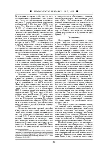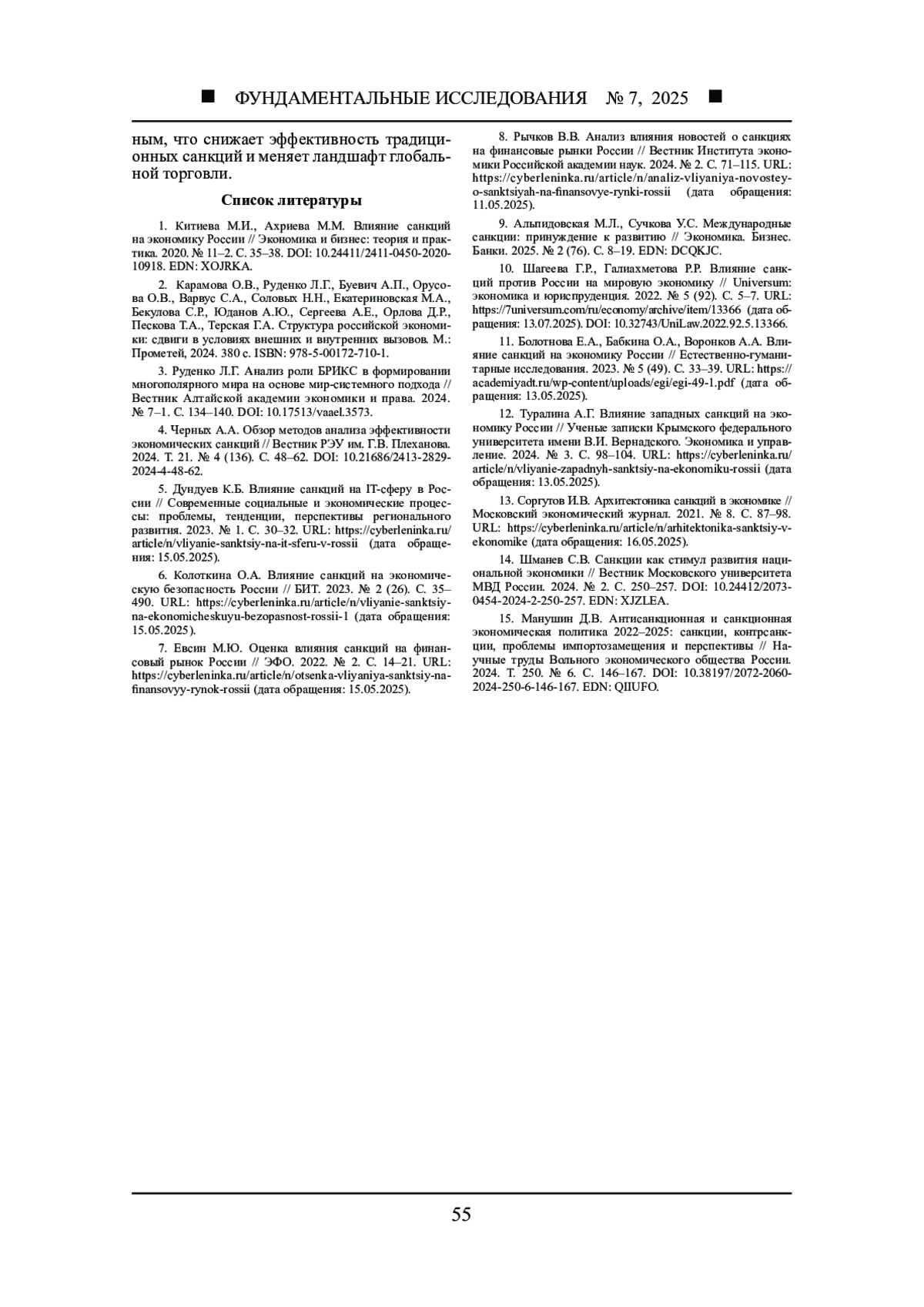 15. Манушин Д.В. Антисанкционная и санкционная экономическая политика 2022-2025: санкции, контрсанкции, проблемы импортозамещения и перспективы // Научные труды Вольного экономического общества России. 2024. Т. 250. № 6. С. 146-167. DOI: 10.38197/2072-20602024-250-6-146-167 EDN: QIIUFO