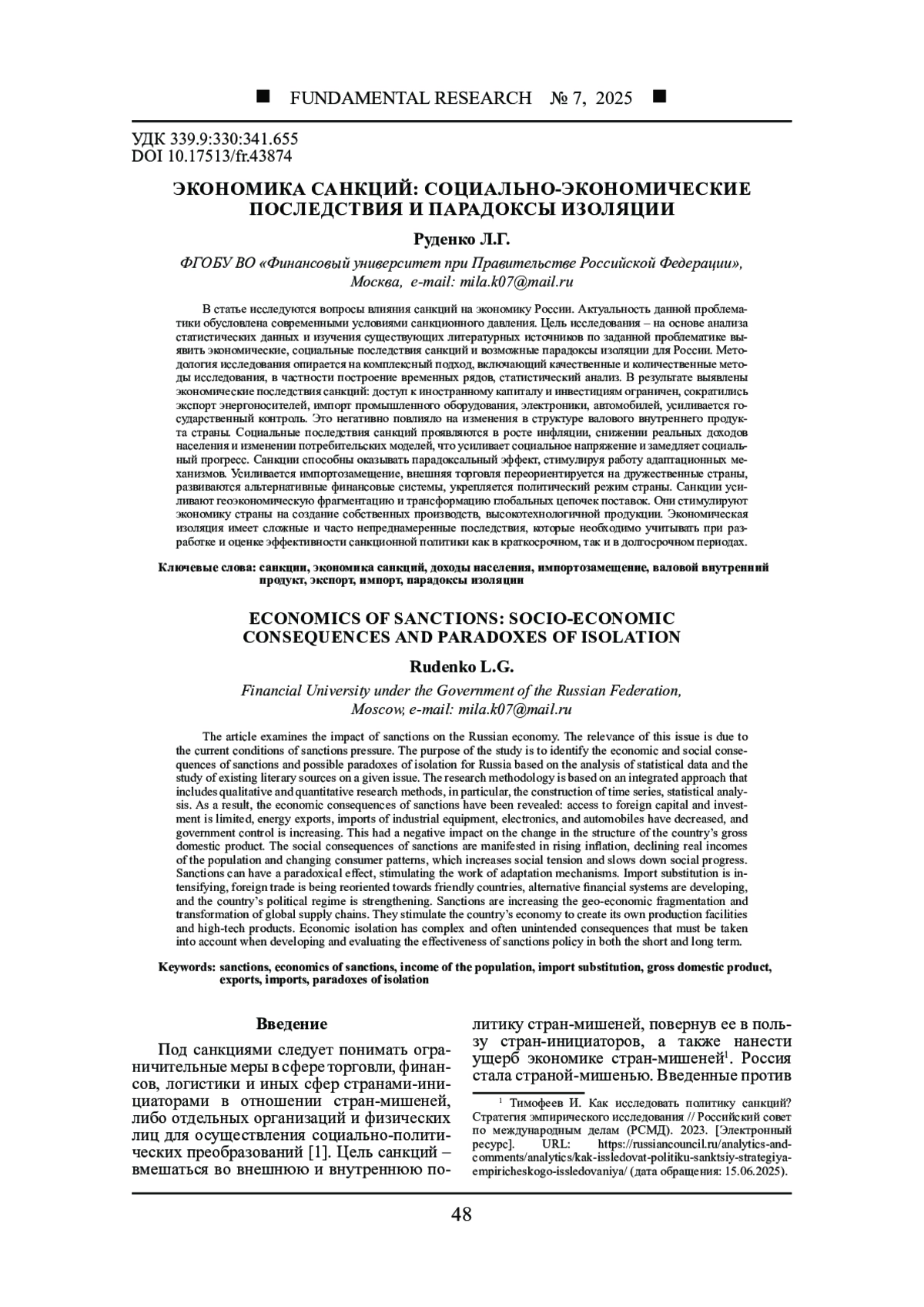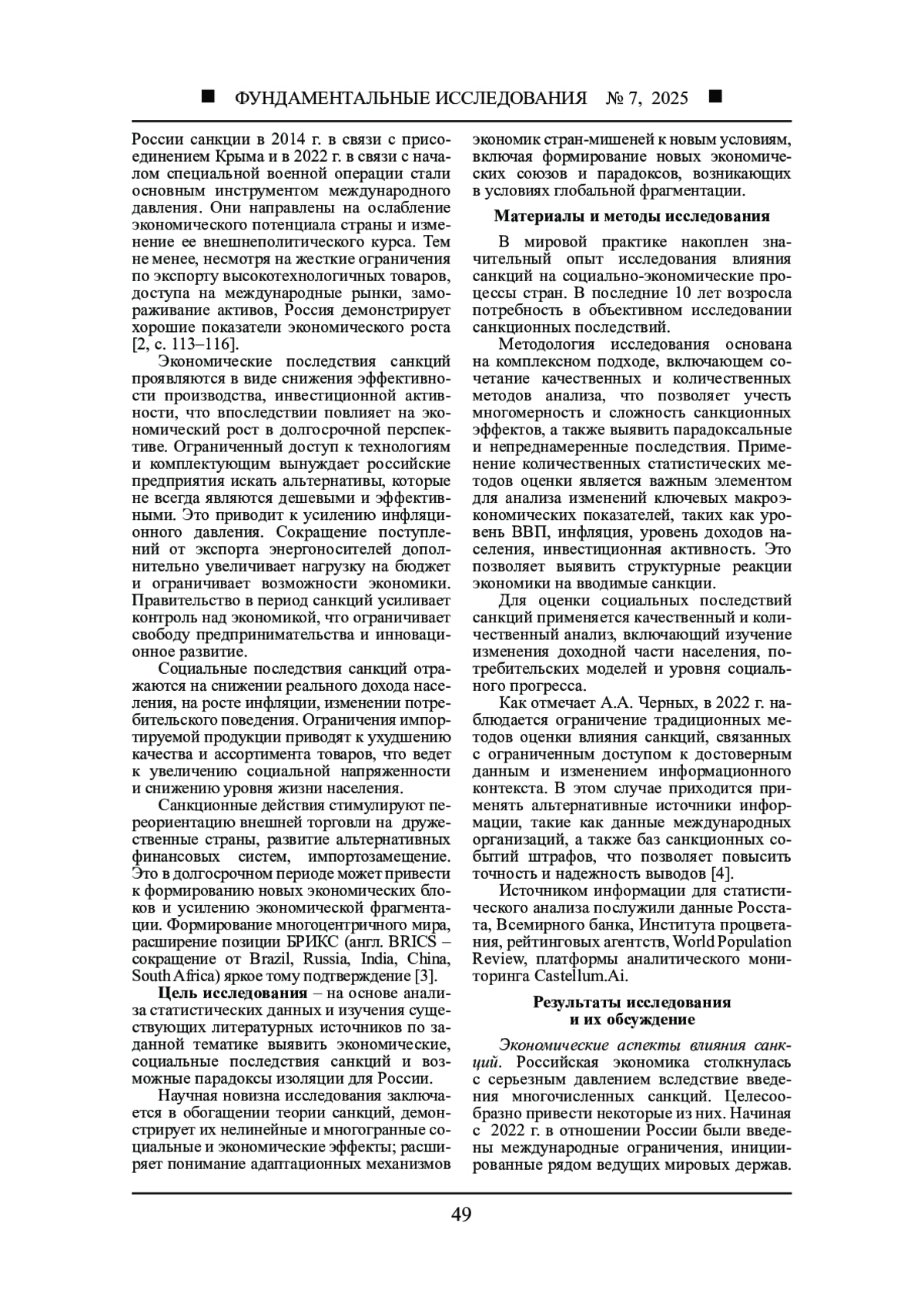 В статье исследуются вопросы влияния санкций на экономику России. Актуальность данной проблематики обусловлена современными условиями санкционного давления. Цель исследования - на основе анализа статистических данных и изучения существующих литературных источников по заданной проблематике выявить экономические, социальные последствия санкций и возможные парадоксы изоляции для России. Методология исследования опирается на комплексный подход, включающий качественные и количественные методы исследования, в частности построение временных рядов, статистический анализ. В результате выявлены экономические последствия санкций: доступ к иностранному капиталу и инвестициям ограничен, сократились экспорт энергоносителей, импорт промышленного оборудования, электроники, автомобилей, усиливается государственный контроль. Это негативно повлияло на изменения в структуре валового внутреннего продукта страны. Социальные последствия санкций проявляются в росте инфляции, снижении реальных доходов населения и изменении потребительских моделей, что усиливает социальное напряжение и замедляет социальный прогресс. Санкции способны оказывать парадоксальный эффект, стимулируя работу адаптационных механизмов. Усиливается импортозамещение, внешняя торговля переориентируется на дружественные страны, развиваются альтернативные финансовые системы, укрепляется политический режим страны. Санкции усиливают геоэкономическую фрагментацию и трансформацию глобальных цепочек поставок. Они стимулируют экономику страны на создание собственных производств, высокотехнологичной продукции. Экономическая изоляция имеет сложные и часто непреднамеренные последствия, которые необходимо учитывать при разработке и оценке эффективности санкционной политики как в краткосрочном, так и в долгосрочном периодах.