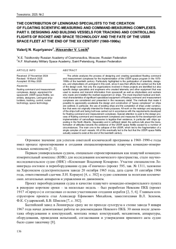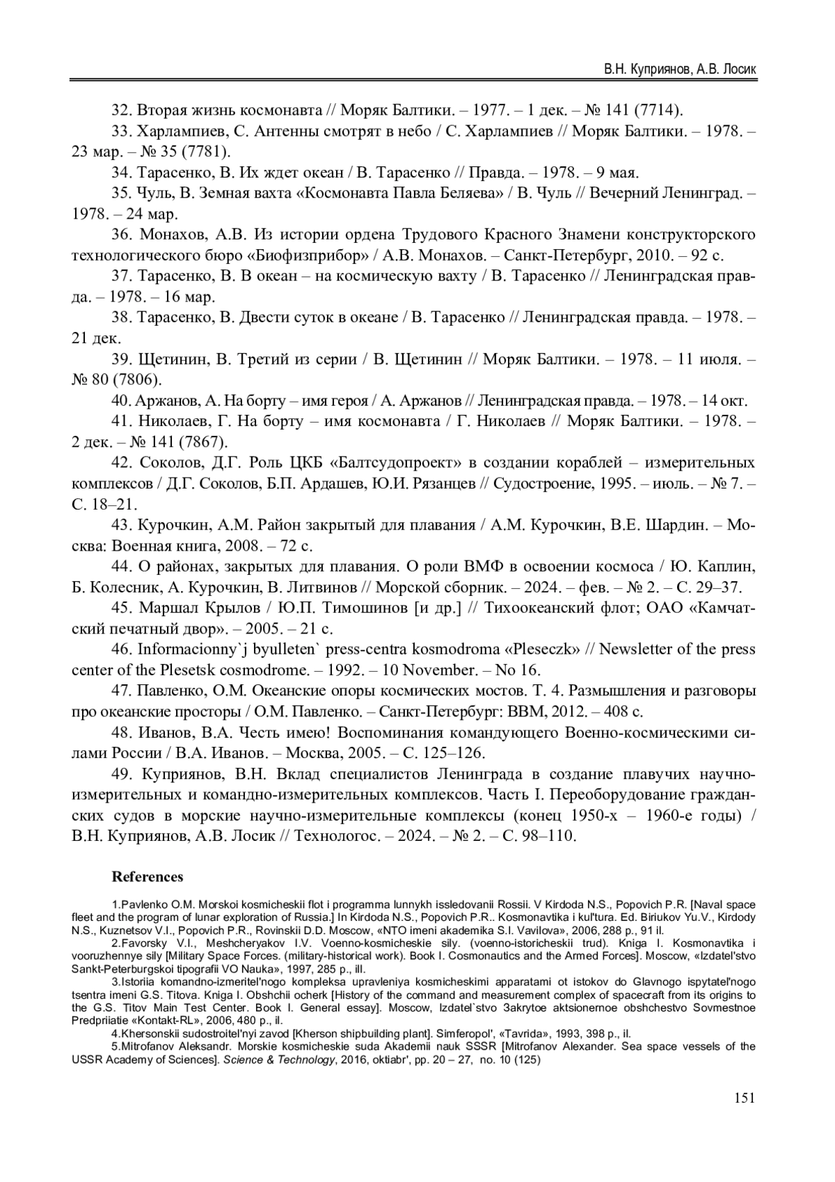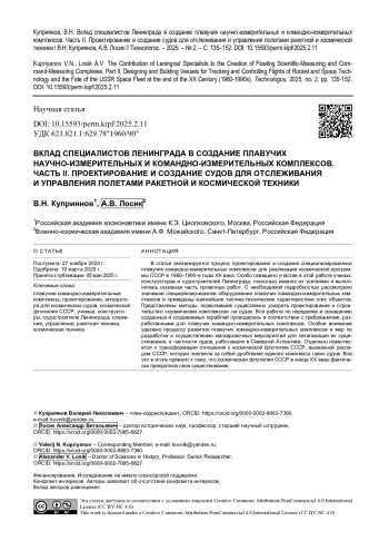 49. Куприянов, В.Н. Вклад специалистов Ленинграда в создание плавучих научно-измерительных и командно-измерительных комплексов. Часть I. Переоборудование гражданских судов в морские научно-измерительные комплексы (конец 1950-х - 1960-е годы) / В.Н. Куприянов, А.В. Лосик // Технологос. - 2024. - № 2. - С. 98-110. EDN: KARDJG