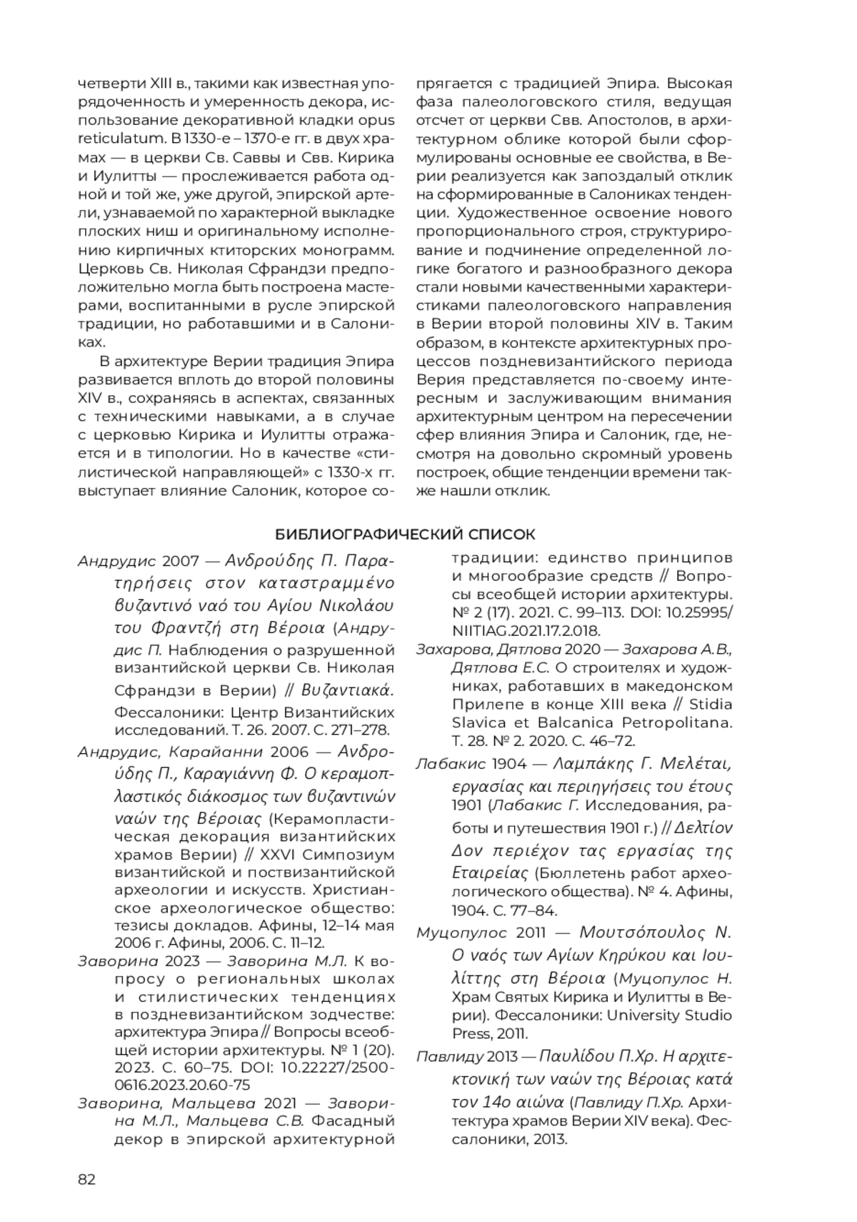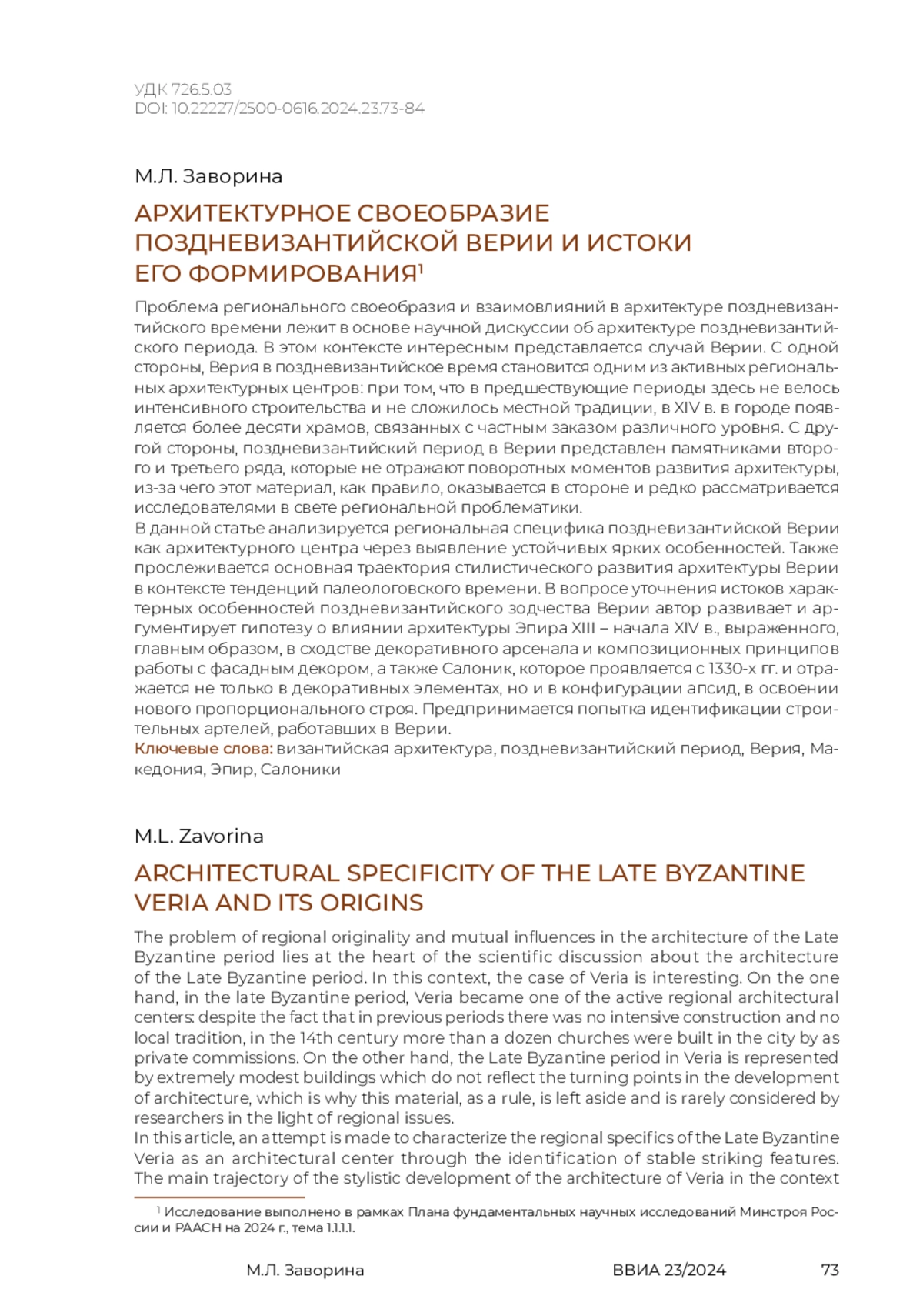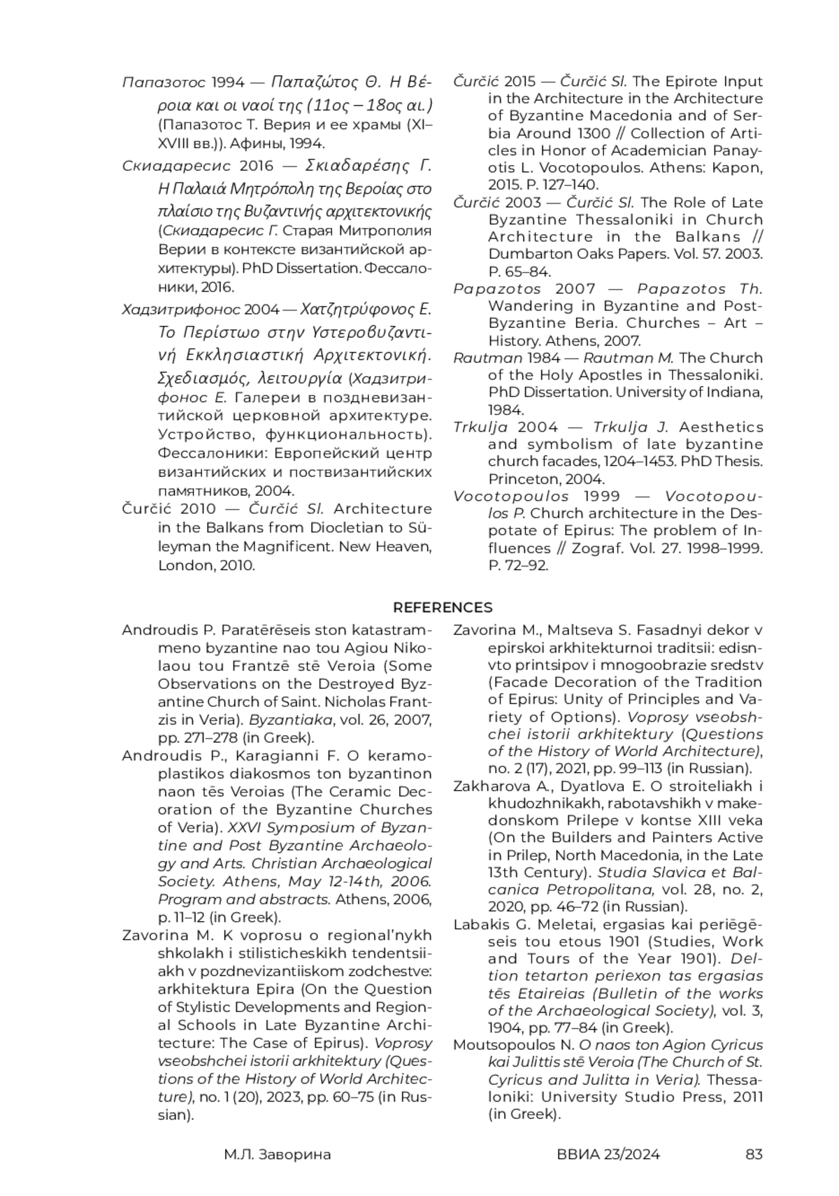 ЗАВОРИНА М. Л. АРХИТЕКТУРНОЕ СВОЕОБРАЗИЕ ПОЗДНЕВИЗАНТИЙСКОЙ ВЕРИИ И ИСТОКИ ЕГО ФОРМИРОВАНИЯ // ВОПРОСЫ ВСЕОБЩЕЙ ИСТОРИИ АРХИТЕКТУРЫ. 2024. №2 (23)