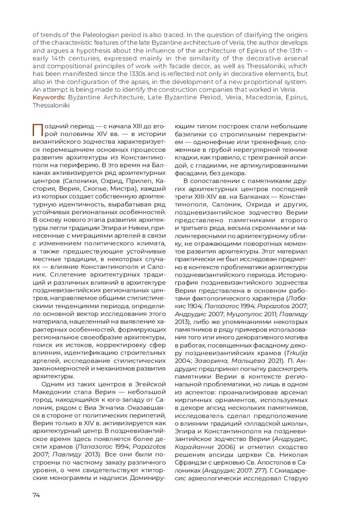 В данной статье анализируется региональная специфика поздневизантийской Верии как архитектурного центра через выявление устойчивых ярких особенностей. Также прослеживается основная траектория стилистического развития архитектуры Верии в контексте тенденций палеологовского времени. В вопросе уточнения истоков характерных особенностей поздневизантийского зодчества Верии автор развивает и аргументирует гипотезу о влиянии архитектуры Эпира XIII – начала XIV в., выраженного, главным образом, в сходстве декоративного арсенала и композиционных принципов работы с фасадным декором, а также Салоник, которое проявляется с 1330-х гг. и отражается не только в декоративных элементах, но и в конфигурации апсид, в освоении нового пропорционального строя. Предпринимается попытка идентификации строительных артелей, работавших в Верии.