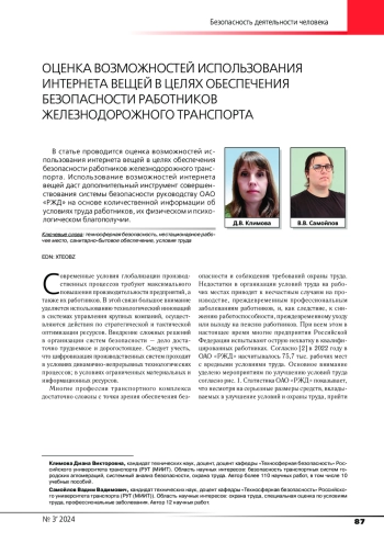 В статье проводится оценка возможностей использования интернета вещей в целях обеспечения безопасности работников железнодорожного транспорта. Использование возможностей интернета вещей даст дополнительный инструмент совершенствования системы безопасности руководству ОАО «РЖД» на основе количественной информации об условиях труда работников, их физическом и психологическом благополучии.