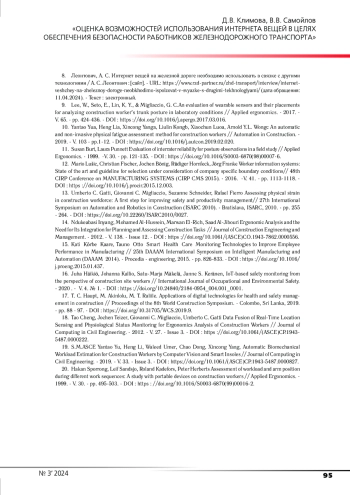 3. Климова, Д. В. Особенности обеспечения безопасных условий труда на нестационарных рабочих местах работников железнодорожного транспорта / Д. В. Климова. - Текст: непосредственный // Наука и техника транспорта. - 2024. - № 1. - С. 88-96. -. EDN: UGXADB