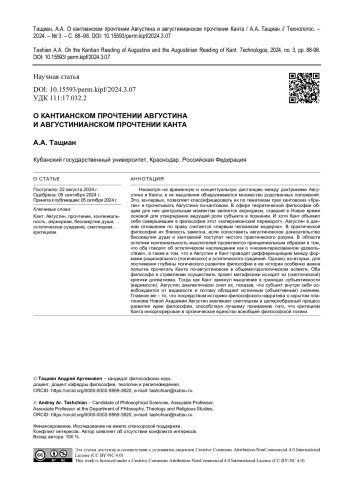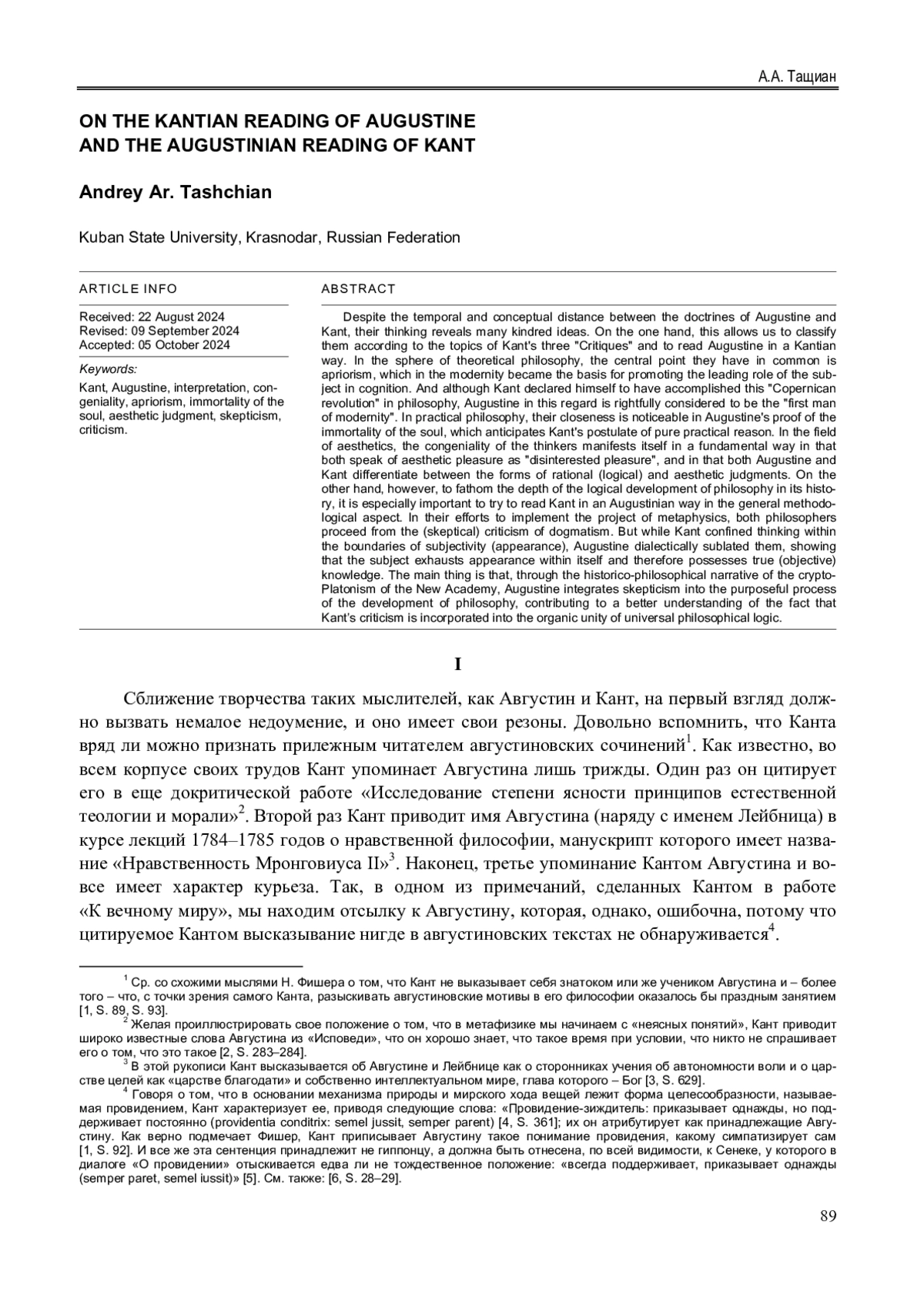 Несмотря на временную и концептуальную дистанцию между доктринами Августина и Канта, в их мышлении обнаруживается множество родственных положений. Это, во-первых, позволяет классифицировать их по тематикам трех кантовских «Критик» и прочитывать Августина по-кантовски. В сфере теоретической философии общим для них центральным моментом является априоризм, ставший в Новое время основой для утверждения ведущей роли субъекта в познании. И хотя Кант объявил себя совершившим в философии этот «коперниканский переворот», Августин в данном отношении по праву считается «первым человеком модерна». В практической философии их близость заметна, если сопоставить августиновское доказательство бессмертия души и кантовский постулат чистого практического разума. В области эстетики конгениальность мыслителей проявляется принципиальным образом в том, что оба говорят об эстетическом наслаждении как о «незаинтересованном удовольствии», а также в том, что и Августин и Кант проводят дифференциацию между формами рационального (логического) и эстетического суждений. Однако, во-вторых, для постижения глубины логического развития философии в ее истории особенно важна попытка прочитать Канта по-августиновски в общеметодологическом аспекте. Оба философа в стремлении осуществить проект метафизики исходят из (скептической) критики догматизма. Тогда как Кант замкнул мышление в границах субъективности (видимости), Августин диалектически снял их, показав, что субъект внутри себя освобождается от видимости и потому обладает истинным (объективным) знанием. Главное же - то, что посредством историко-философского нарратива о скрытом платонизме Новой Академии Августин вовлекает скептицизм в целесообразный процесс развития идеи философии, способствуя лучшему пониманию того, что критицизм Канта инкорпорирован в органическое единство всеобщей философской логики.
