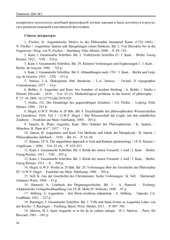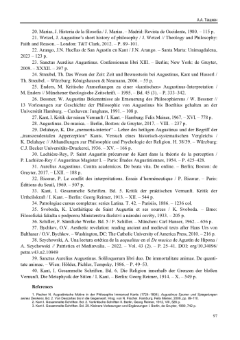 1. Fischer, N. Augustinische Motive in der Philosophie Immanuel Kants (1724-1804) / N. Fischer // Augustinus Spuren und Spiegelungen seines Denkens. Bd. 2. Von Descartes bis in die Gegenwart / Hrsg. von N. Fischer. - Hamburg: Felix Meiner, 2009. - P. 89-110.