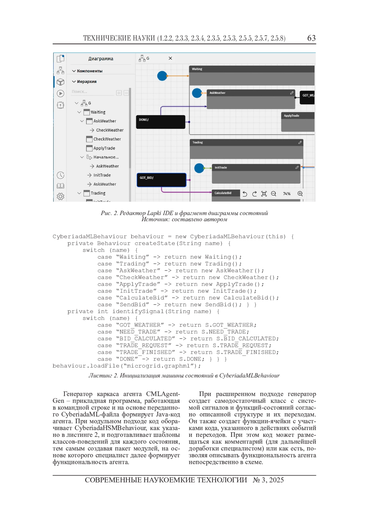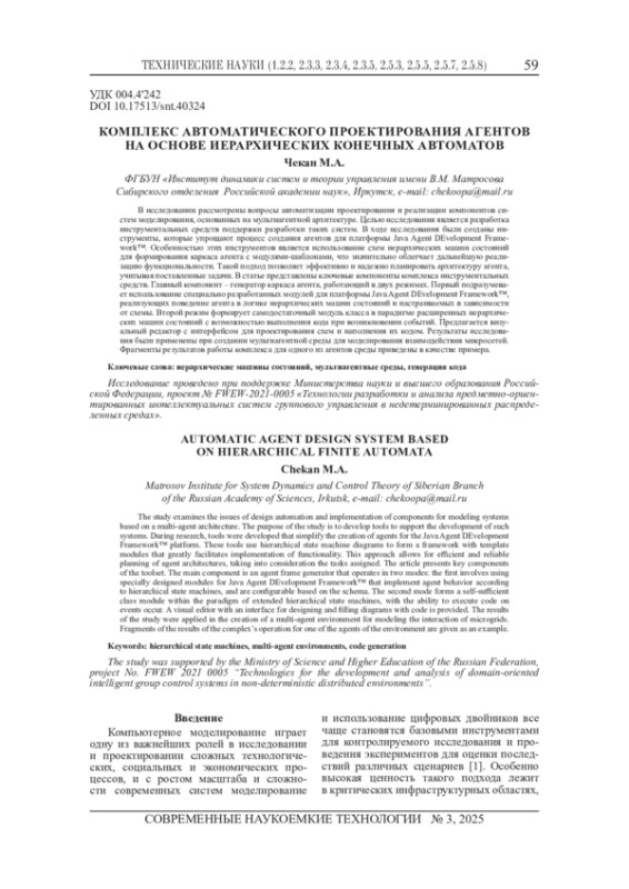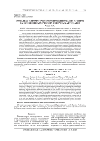 ЧЕКАН М. А. КОМПЛЕКС АВТОМАТИЧЕСКОГО ПРОЕКТИРОВАНИЯ АГЕНТОВ НА ОСНОВЕ ИЕРАРХИЧЕСКИХ КОНЕЧНЫХ АВТОМАТОВ // СОВРЕМЕННЫЕ НАУКОЕМКИЕ ТЕХНОЛОГИИ. 2025. № 3