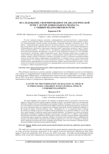 В статье освещены вопросы, связанные с формированием диалогической речи у дошкольников, у которых диагностировано общее недоразвитие речи. Диалогическая речь выступает важным элементом коммуникативных умений, которые способствуют успешной адаптации и обучению детей. Цель работы - проанализировать уровень развития диалогической речи у детей дошкольного возраста с общим недоразвитием речи. Практическая часть опытно-экспериментального исследования проводилась в Муниципальном автономном дошкольном образовательном учреждении городского округа Саранск «Центр развития ребёнка - детский сад № 9». Эксперимент, направленный на изучение сформированности диалогической речи, был проведен с участием 16 детей дошкольного возраста (5-6 лет), имеющих логопедическое заключение «общее недоразвитие речи». Была проведена диагностика с помощью методики «Изучение сформированности диалога у дошкольников», разработанной А. В. Чулковой, включающей задания, которые позволяли установить следующие аспекты: особенности владения речевым этикетом; реализация запроса информации; реплицирование; составление диалога. Анализ выполнения заданий показал, что большая часть детей дошкольного возраста с общим недоразвитием речи имеют низкий уровень сформированности диалогической речи. Данные диагностики свидетельствуют о необходимости усиления логопедической работы по формированию диалогической речи у детей дошкольного возраста с общим недоразвитием речи.