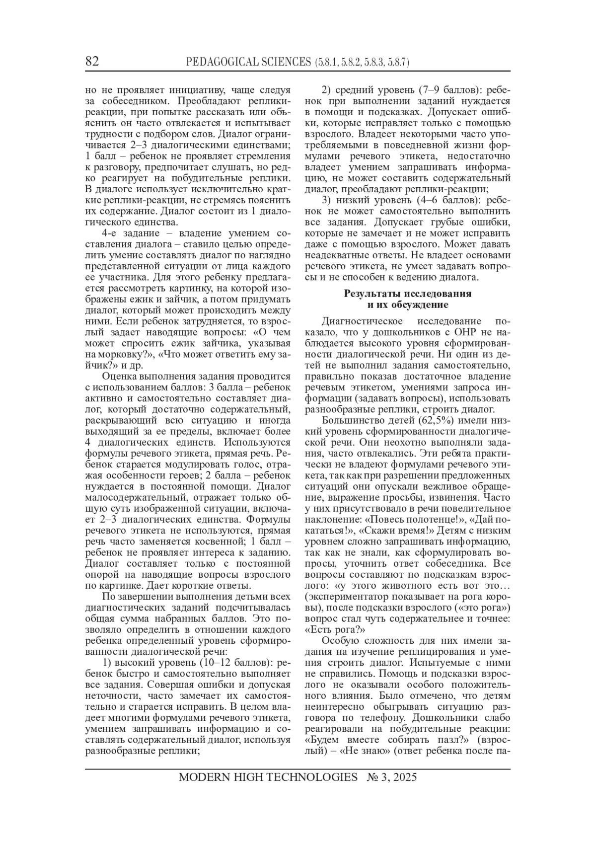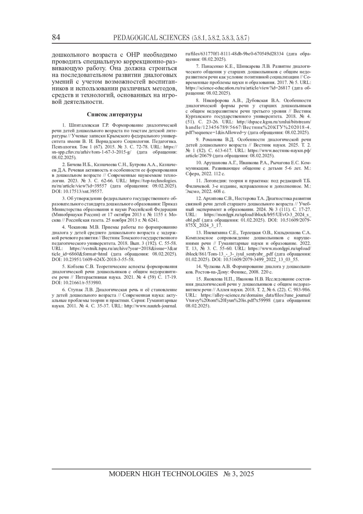 7. Панасенко К.Е., Шинкарева Л.В. Развитие диалогического общения у старших дошкольников с общим недоразвитием речи как условие позитивной социализации // Современные проблемы науки и образования. 2017. № 5. URL: https://science-education.ru/ru/article/view?id=26817 (дата обращения: 08.02.2025). EDN: ZQNIWF