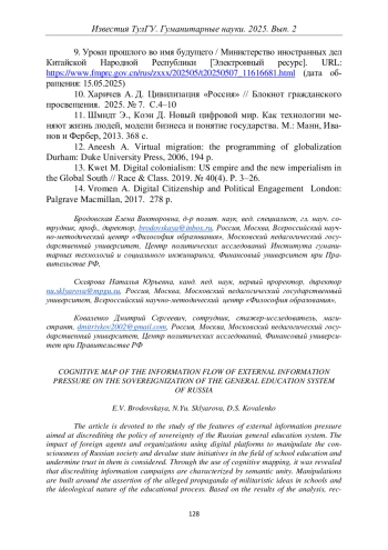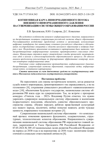 Исследуются особенности внешнего информационного давления, направленного на дискредитацию политики суверенизации российской системы общего образования. Рассматривается воздействие зарубежных агентов и организаций, использующих цифровые платформы для манипуляции сознанием российского общества и обесценивания государственных инициатив в области школьного образования и подрыва доверия к ним. Посредством применения когнитивного картирования было выявлено, что дискредитационные информационные кампании характеризуются смысловым единством. Манипуляции строятся вокруг утверждения о якобы пропаганде милитаристских идей в школах и идеологизированности образовательного процесса. По итогам анализа предложены рекомендации по формированию эффективных контрмер, включая мониторинг информационных атак.