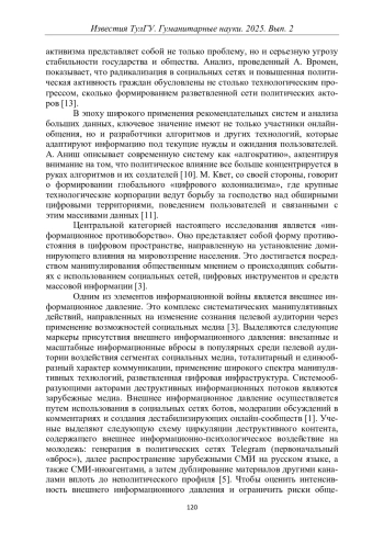 2. Бродовская Е.В., Азаров А.А. Алгоритм автоматизированной идентификации информационных потоков внешнего деструктивного информационно-психологического воздействия на пользователей социальных медиа /// Власть. 2024. № 2. С. 89-96. EDN: TAKZAH