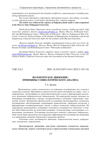 Представлена модель комплексного исследования волонтерства как сложного социального явления. Проводится социологический анализ тематики на макро-, мезо- и микроуровнях, демонстрируя их взаимодополняемость и роль в формировании целостного понимания добровольческой деятельности. На макроуровне акцент делается на интеграции волонтерства в процесс воспроизводства и развития современных социальных систем. Мезоуровень предполагает исследование организационных механизмов волонтерства, обеспечивающих координацию деятельности, управление ресурсами и формирование институциональных связей, и общем контексте добровольчества. На микроуровне анализируются мотивация участников волонтерского движения и влияние этой деятельности на личностное развитие, межличностные коммуникации и социализацию участников. Результаты комплексного подхода к феномену добровольчества могут быть применены для повышения эффективности волонтерских инициатив и их интеграции в решение актуальных социальных проблем.