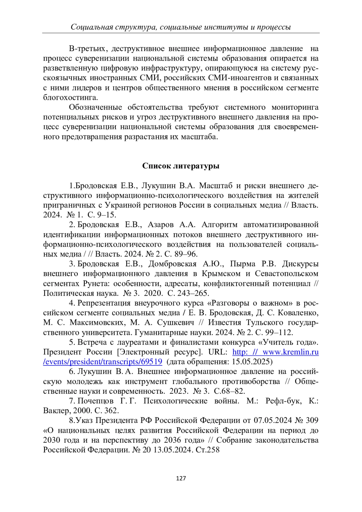 1. Бродовская Е.В., Лукушин В.А. Масштаб и риски внешнего деструктивного информационно-психологического воздействия на жителей приграничных с Украиной регионов России в социальных медиа // Власть. 2024. № 1. С. 9-15. EDN: RBAQFS
