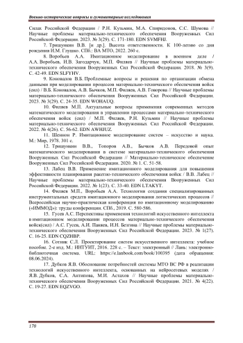 6. Кузьмин Р.Н. Исторические аспекты применения имитационного моделирования процессов материально-технического обеспечения в Вооруженных Силах Российской Федерации / Р.Н. Кузьмин, М.А. Спиридонов, С.С. Шумова // Научные проблемы материально-технического обеспечения Вооруженных Сил Российской Федерации. 2023. № 3(29). С. 171-180. EDN: SVMFHJ