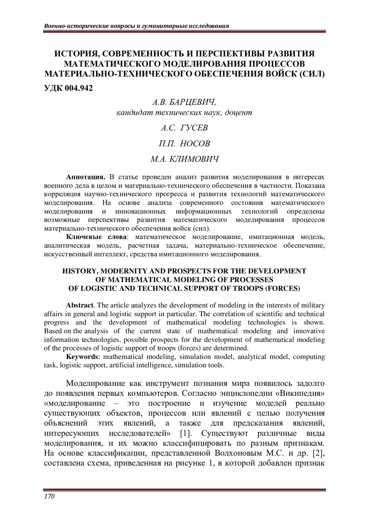 В статье проведен анализ развития моделирования в интересах военного дела в целом и материально-технического обеспечения в частности. Показана корреляция научно-технического прогресса и развития технологий математического моделирования. На основе анализа современного состояния математического моделирования и инновационных информационных технологий определены возможные перспективы развития математического моделирования процессов материально-технического обеспечения войск (сил).