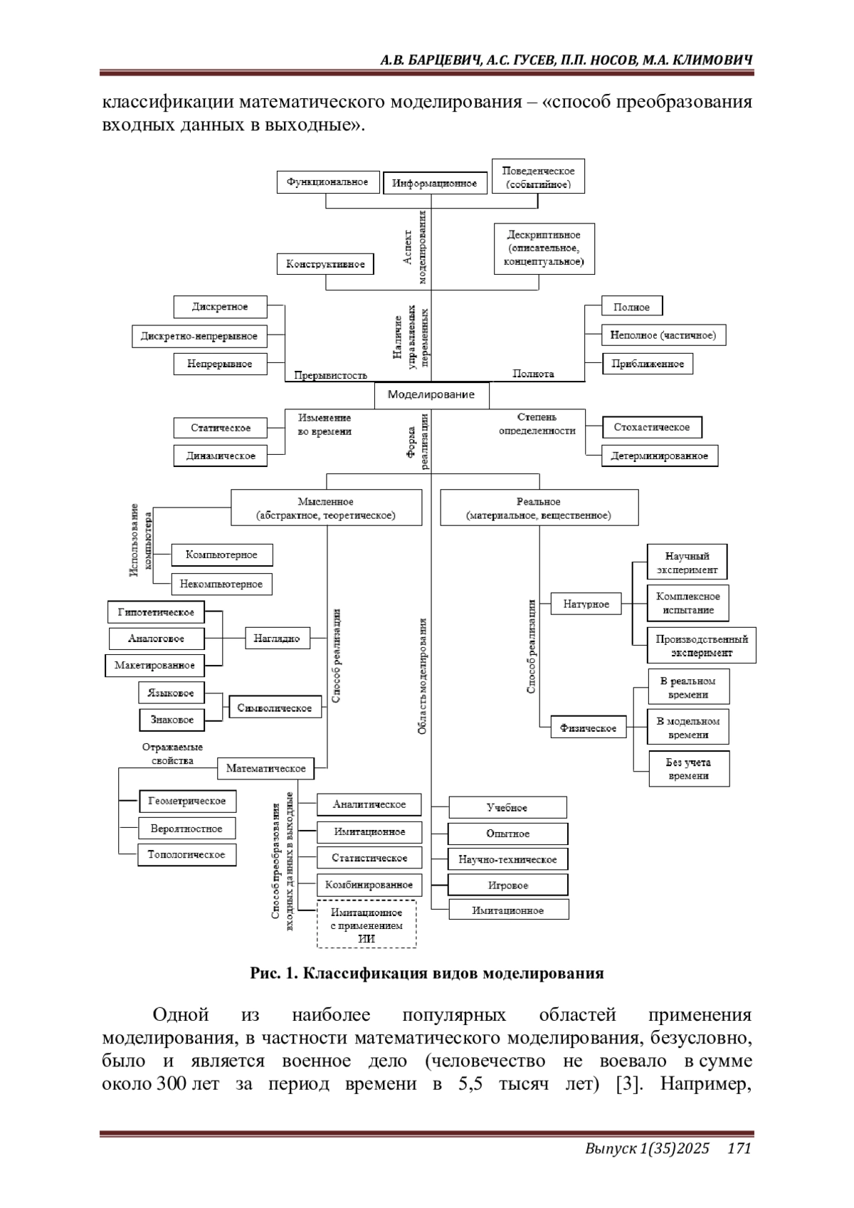 Моделирование как инструмент познания мира появилось задолго до появления первых компьютеров. Согласно энциклопедии «Википедия» «моделирование – это построение и изучение моделей реально существующих объектов, процессов или явлений с целью получения объяснений этих явлений, а также для предсказания явлений, интересующих исследователей» [1]. Существуют различные виды моделирования, и их можно классифицировать по разным признакам. На основе классификации, представленной Волхоновым М. С. и др. [2], составлена схема, приведенная на рисунке, в которой добавлен признак классификации математического моделирования – «способ преобразования входных данных в выходные».