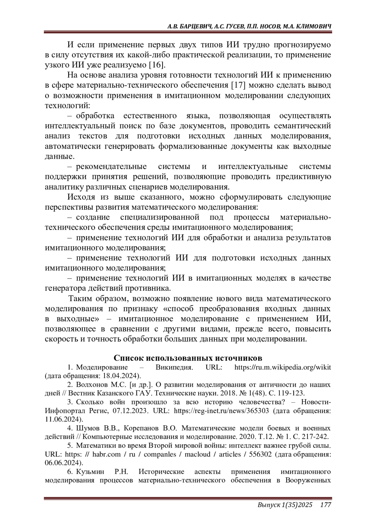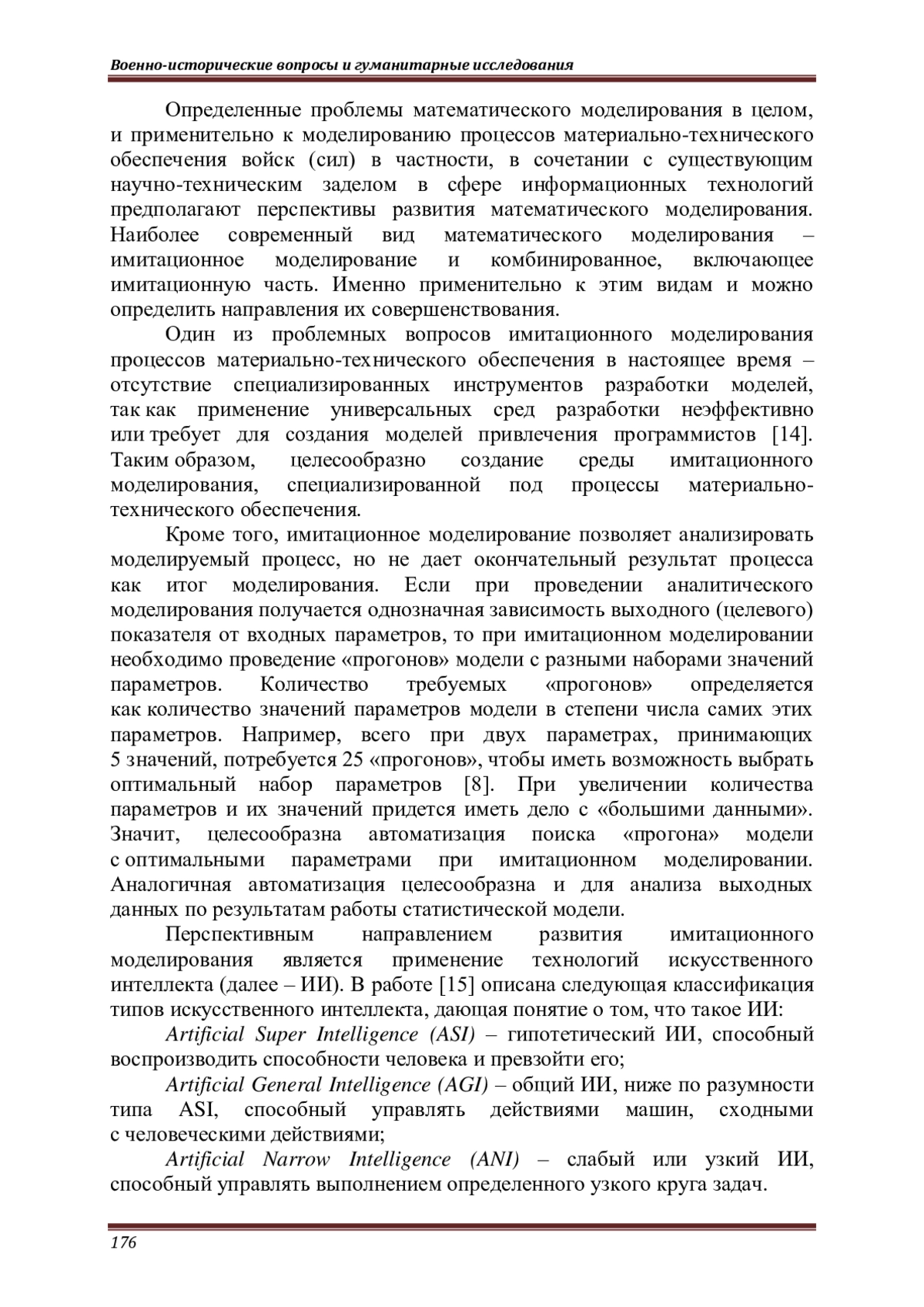 15. Гусев А.С. Перспективы применения технологий искусственного интеллекта в имитационном моделировании процессов материально-технического обеспечения войск(сил) / А.С. Гусев, А.И. Паняев, И.Н. Безгина // Научные проблемы материально-технического обеспечения Вооруженных Сил Российской Федерации. 2023. № 1(27). С. 16-25. EDN: CQZHBP