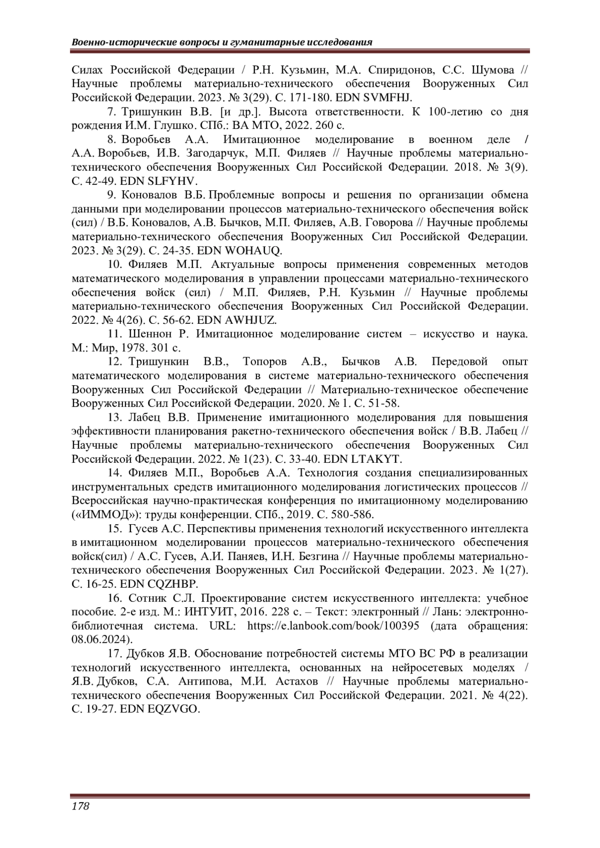 17. Дубков Я.В. Обоснование потребностей системы МТО ВС РФ в реализации технологий искусственного интеллекта, основанных на нейросетевых моделях / Я.В. Дубков, С.А. Антипова, М.И. Астахов // Научные проблемы материально-технического обеспечения Вооруженных Сил Российской Федерации. 2021. № 4(22). С. 19-27. EDN: EQZVGO