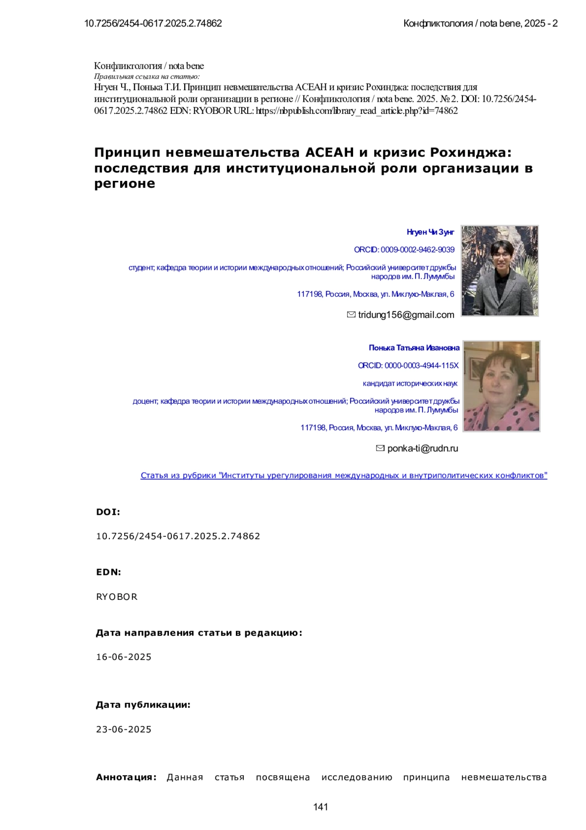 Данная статья посвящена исследованию принципа невмешательства Ассоциации государств Юго-Восточной Азии (АСЕАН) в контексте гуманитарного кризиса рохинджа. Актуальность темы определяется нарастающей международной озабоченностью массовыми нарушениями прав человека в Мьянме и необходимостью оценки возможностей региональных механизмов реагирования. В условиях усиливающейся глобализации и региональной интеграции подобная тема исследования представляется необходимой для переосмысления устойчивости нормативных основ АСЕАН в изменяющейся международной среде. Объектом исследования выступает институциональный принцип невмешательства в деятельности АСЕАН. Предметом является применение этого принципа при кризисе рохинджа и его влияние на внутреннюю и внешнюю политику организации. Цель работы - выяснить, каким образом строгое соблюдение принципа невмешательства влияет на легитимность и институциональную роль. В работе применены методы документального анализа (научные публикации, отчёты неправительственных организаций, нормативные акты и юридические тексты), кейс-стади и анализ вторичных данных. Результаты показывают, что принцип невмешательства блокирует создание обязательных санкционных и контрольных механизмов со стороны AICHR, демонстрирует избирательное применение в интересах сильных членов и фактически выступает инструментом защиты авторитарных режимов, а не прав человека. Результаты данного исследования ставят под вопрос осуществимость существующих подходов АСЕАН к интеграции и разрешению кризисов. Научная новизна заключается в системном раскрытии прямой связи между нормой невмешательства и институциональной слабостью АСЕАН перед лицом гуманитарных катастроф. Выводы рекомендуют реформировать процедуры реализации невмешательства, внедрить эффективные механизмы коллективных санкций за массовые нарушения прав человека и создать при АСЕАН независимый судебный орган по правам человека для балансирования суверенитета и «ответственности защитить».