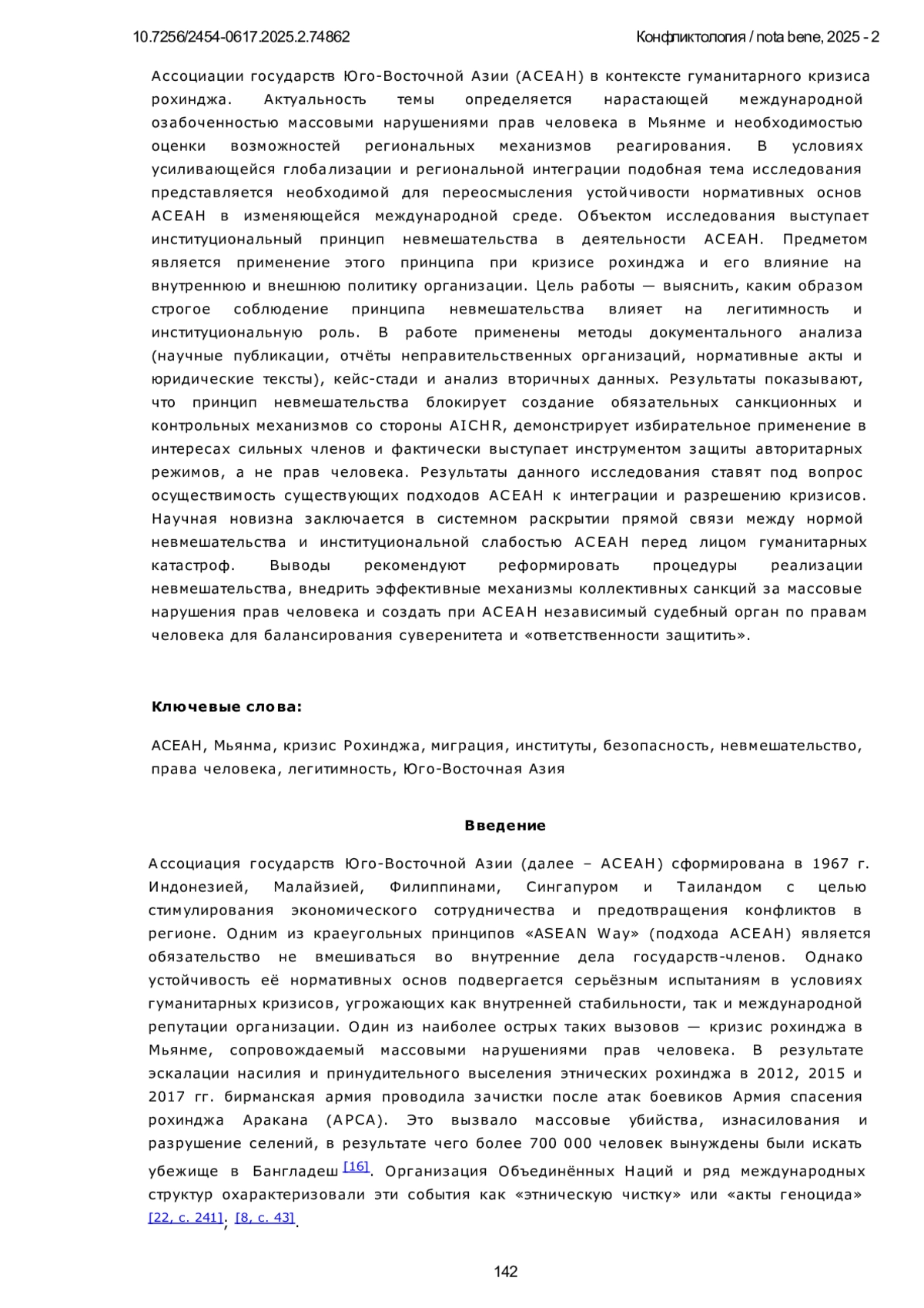 21. Oktavian A., Jamaludin M., Hossain M.B. Non-Interference Principle of ASEAN in the Rohingya Crisis: International Human Rights Law as Alternative Foothold // Intermestic: Journal of International Studies. 2023. Vol. 7, No. 2. P. 618-636. DOI: 10.24198/intermestic.v7n2.11