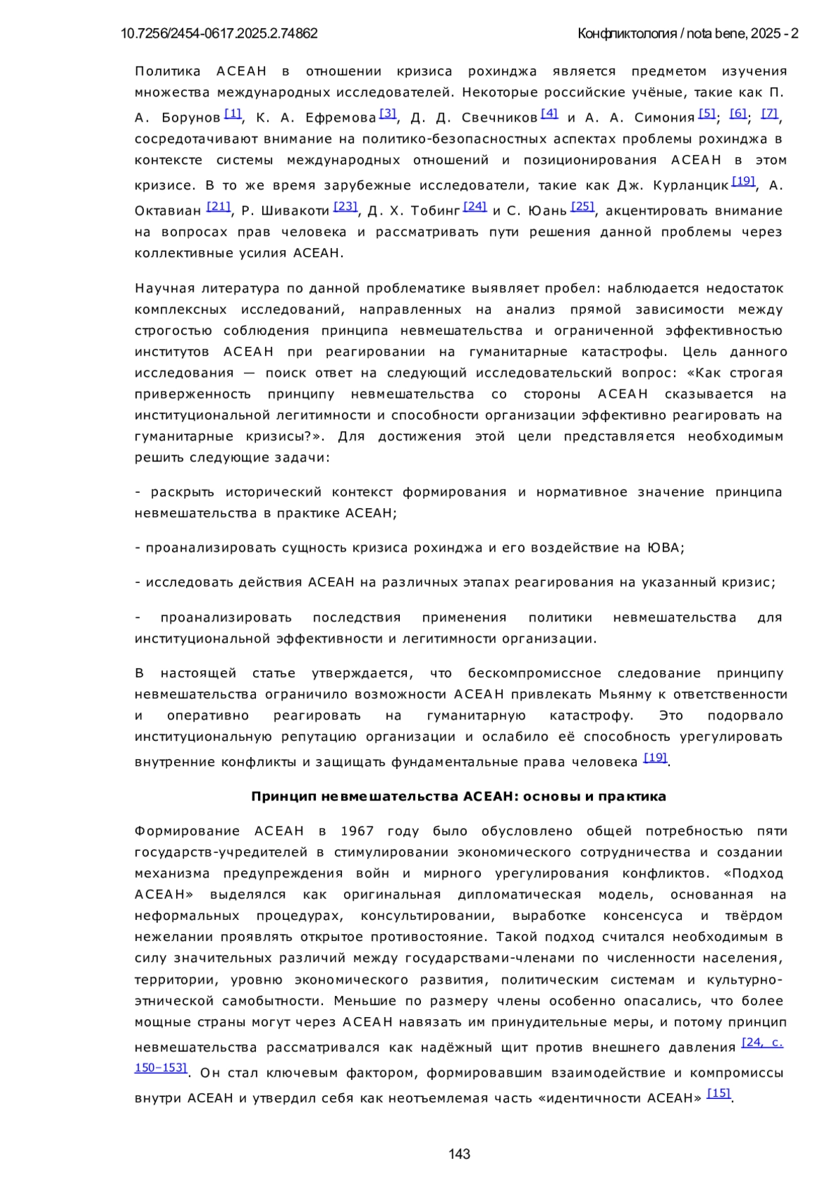 25. Yuan C., Lee B. T. F. ASEAN in the Conflict Management of the Rohingya Crisis // Journal of Autonomy and Security Studies. 2023. Vol. 7, No. 1. P. 39-60.