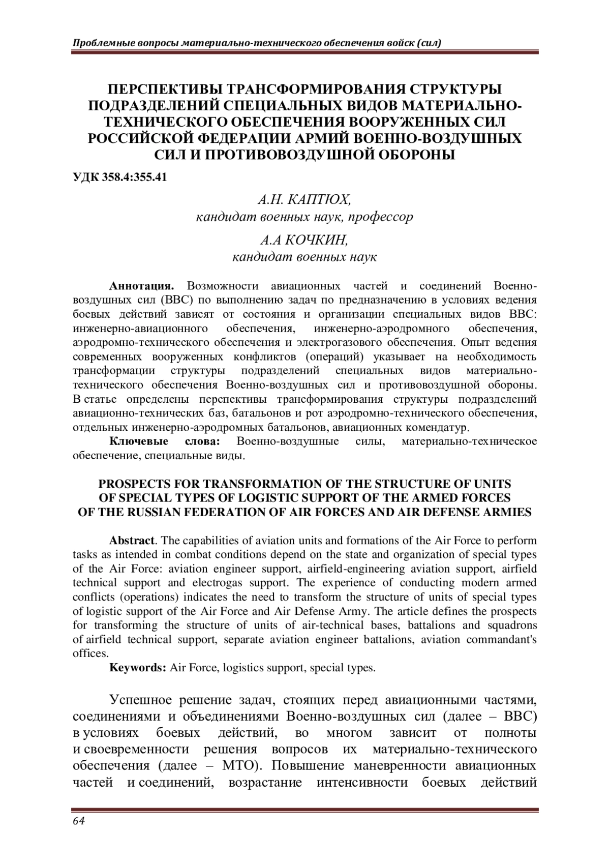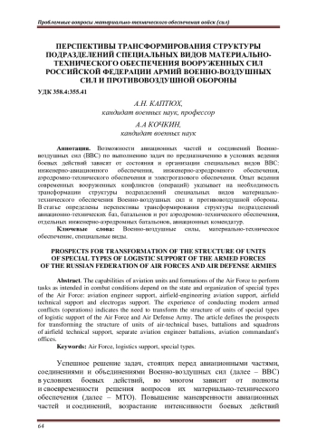 Возможности авиационных частей и соединений Военно-воздушных сил (ВВС) по выполнению задач по предназначению в условиях ведения боевых действий зависят от состояния и организации специальных видов ВВС: инженерно-авиационного обеспечения, инженерно-аэродромного обеспечения, аэродромно-технического обеспечения и электрогазового обеспечения. Опыт ведения современных вооруженных конфликтов (операций) указывает на необходимость трансформации структуры подразделений специальных видов материально-технического обеспечения Военно-воздушных сил и противовоздушной обороны. В статье определены перспективы трансформирования структуры подразделений авиационно-технических баз, батальонов и рот аэродромно-технического обеспечения, отдельных инженерно-аэродромных батальонов, авиационных комендатур.