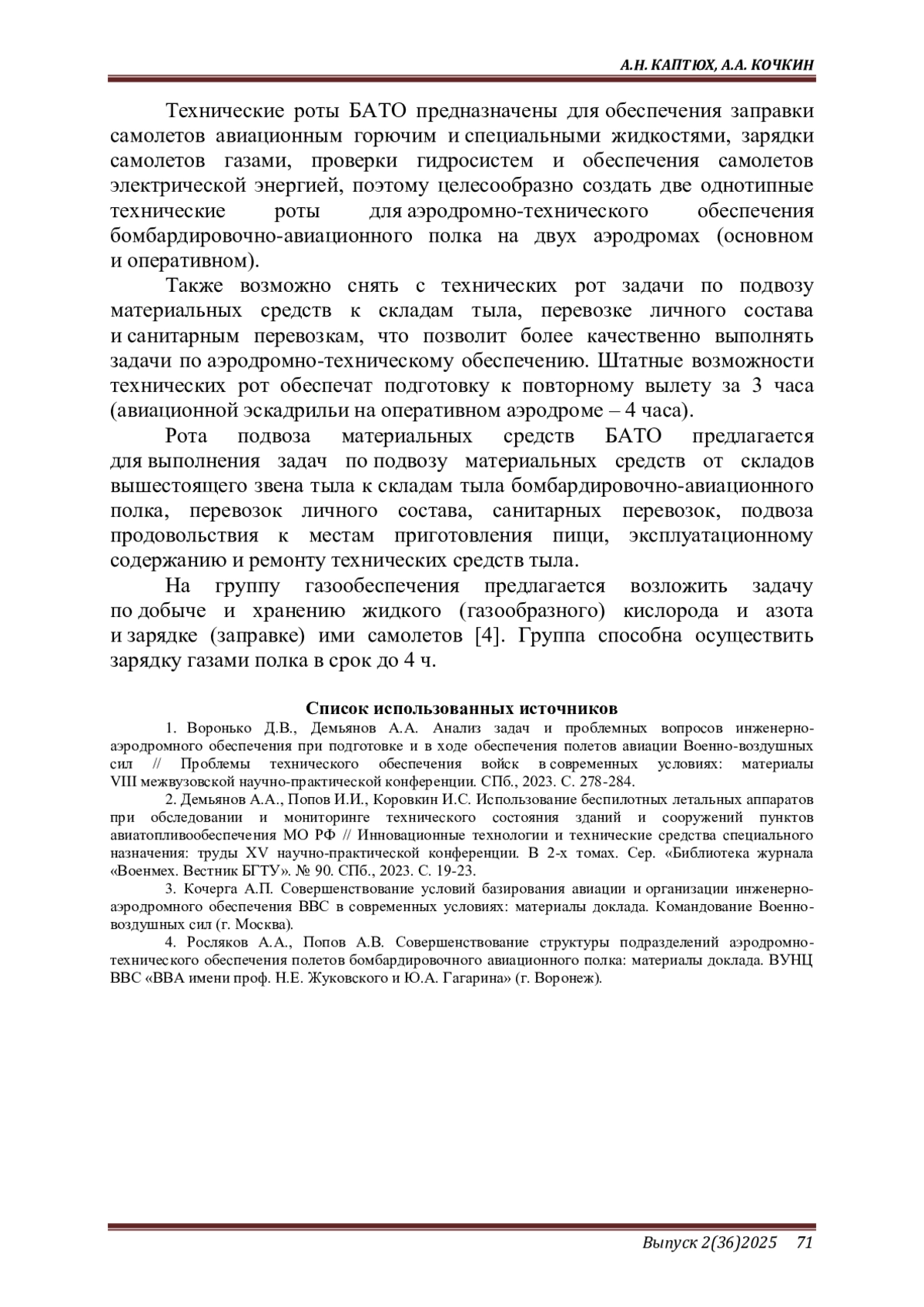 4. Росляков А.А., Попов А.В. Совершенствование структуры подразделений аэродромно-технического обеспечения полетов бомбардировочного авиационного полка: материалы доклада. ВУНЦ ВВС “ВВА имени проф. Н.Е. Жуковского и Ю.А. Гагарина” (г. Воронеж).