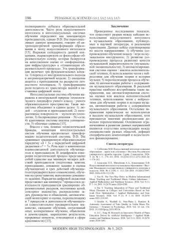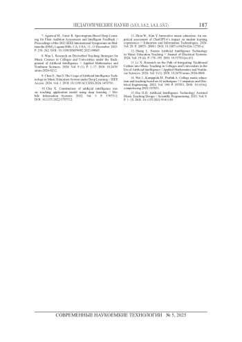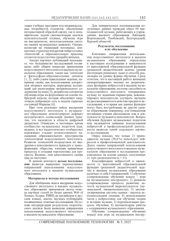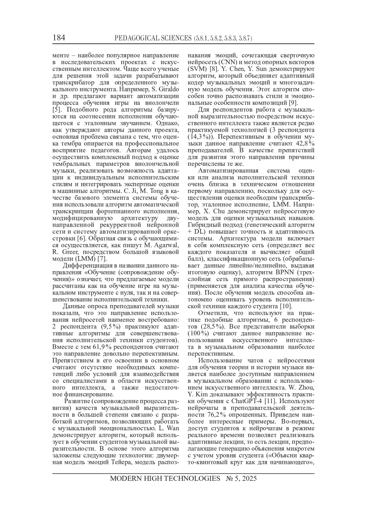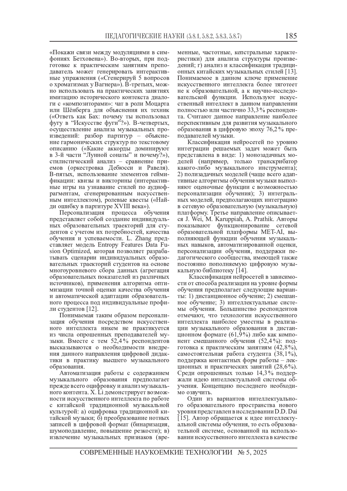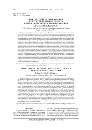 ДУБРОВСКИЙ В. В., ГОРБИК Я. А. НАПРАВЛЕНИЯ ИСПОЛЬЗОВАНИЯ ИСКУССТВЕННОГО ИНТЕЛЛЕКТА В ВЫСШЕМ МУЗЫКАЛЬНОМ ОБРАЗОВАНИИ // СОВРЕМЕННЫЕ НАУКОЕМКИЕ ТЕХНОЛОГИИ. 2025. № 5