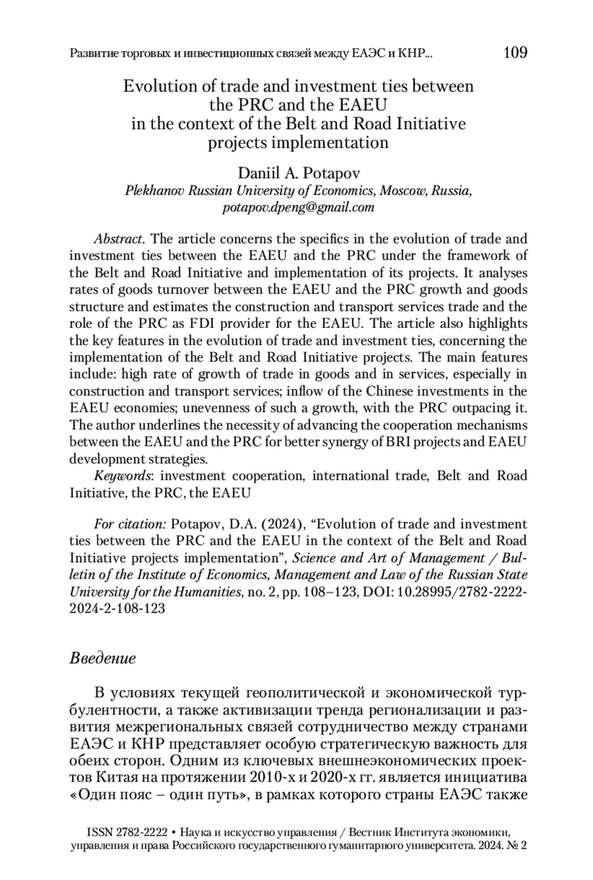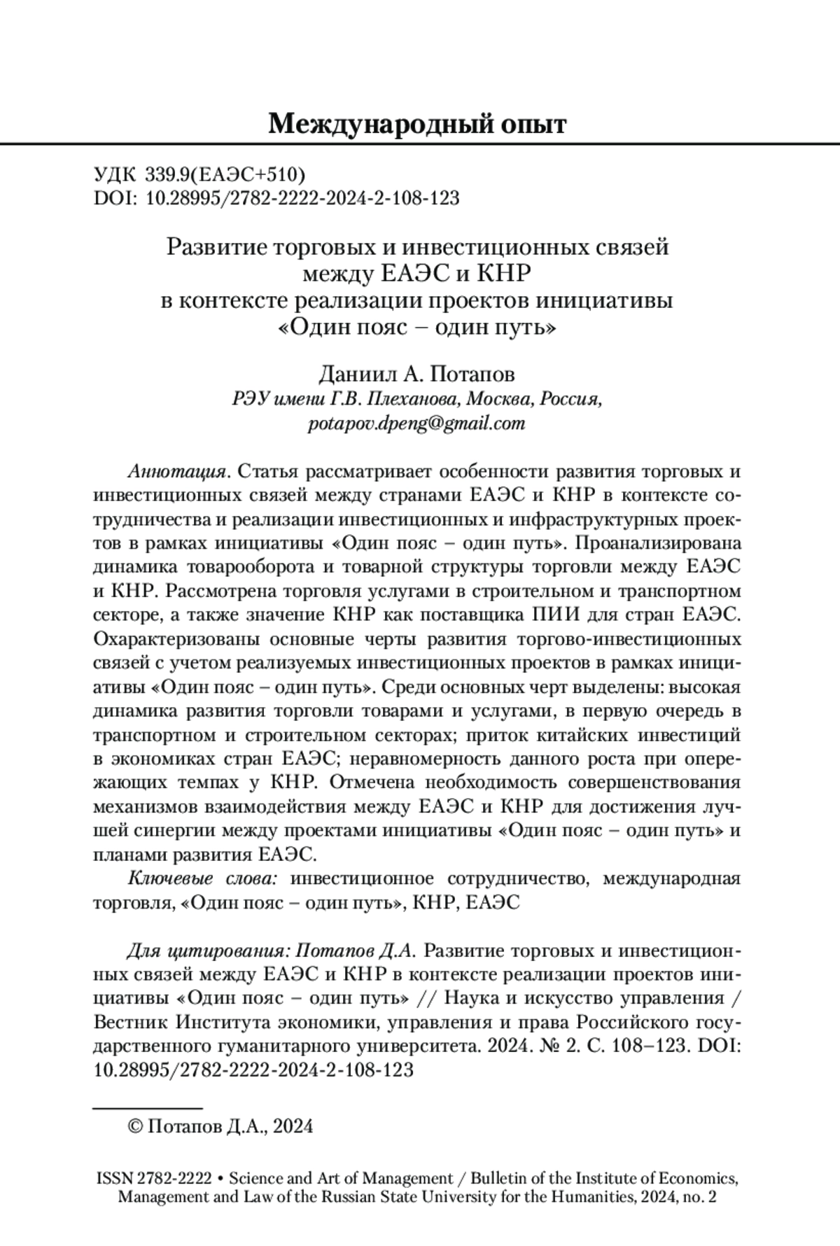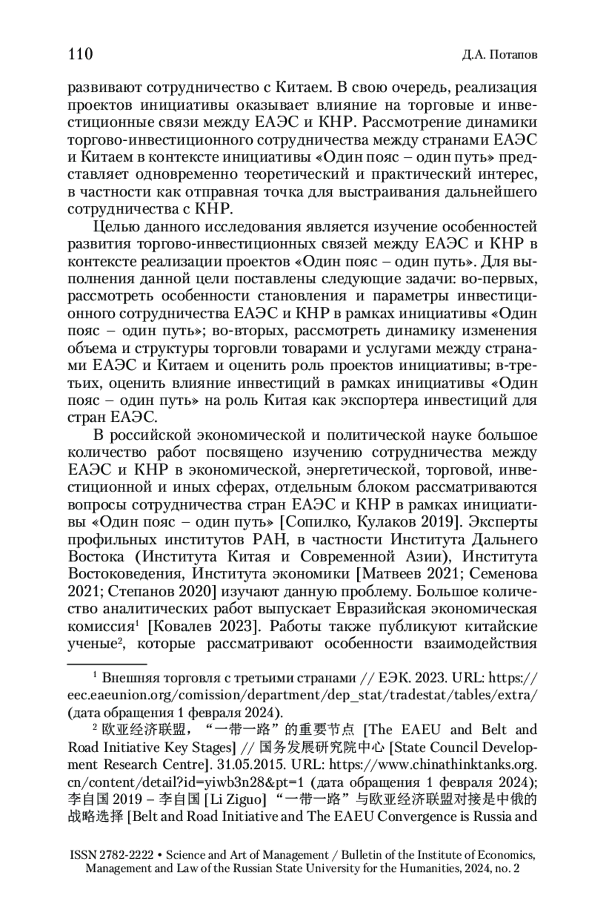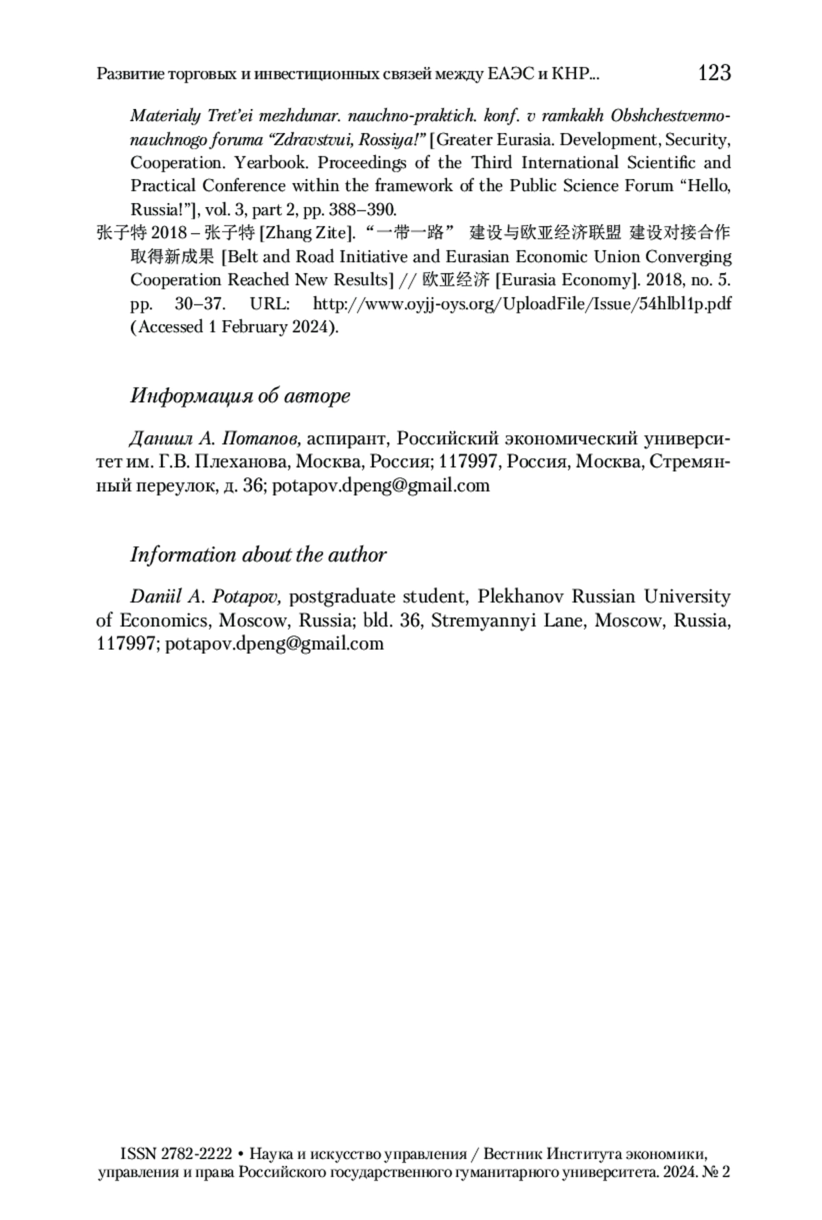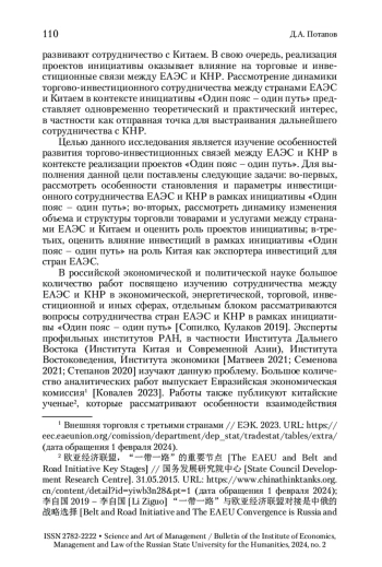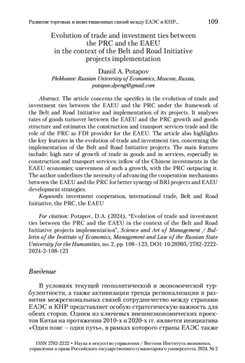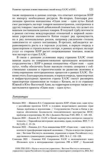 3. Потапов 2022 - Потапов Д.А. Роль инициативы КНР «Один пояс - один путь» в контексте трансформации мировой экономики // Наука и искусство управления / Вестник Института экономики, управления и права Российского государственного гуманитарного университета. 2022. № 4. С. 116-128.