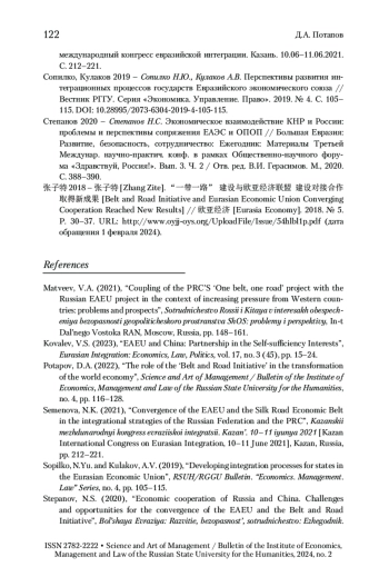 5. Сопилко, Кулаков 2019 - Сопилко Н.Ю., Кулаков А.В. Перспективы развития интеграционных процессов государств Евразийского экономического союза // Вестник РГГУ. Серия «Экономика. Управление. Право». 2019. № 4. С. 105- 115. https://doi.org/10.28995/2073-6304-2019-4-105-115.