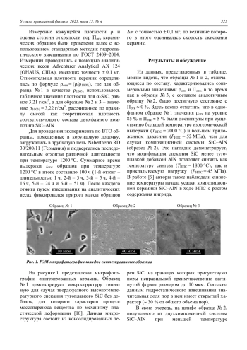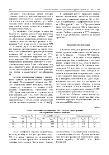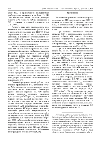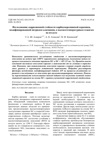 Выполнено сравнительное исследование стойкости к высокотемпературному окислению на воздухе при 1200°С керамических материалов, полученных путем искрового плазменного спекания порошков SiC и SiC + AlN (25 вес. %). Проведен анализ констант пассивного окисления керамик в зависимости от их состава и пористости. Показано, что интенсивность окисления керамик в первую очередь определя-ется уровнем и характером остаточной пористости. Подробно рассмотрены факторы воздействия модифицирующей добавки AlN на процессы уплотнения керамики и последующего ее окисления при высокотемпературных отжигах. Показана перспективность использования данной добавки для получения плотной композиционной керамики на основе SiC с кратно улучшенной коррозионной стойкостью.