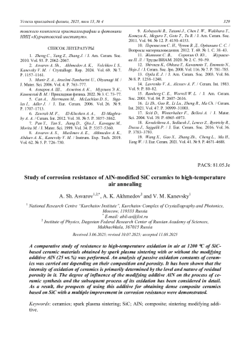 A comparative study of resistance to high-temperature oxidation in air at 1200 C of SiC-based ceramic materials obtained by spark plasma sintering with or without the modifying additive AlN (25 wt.%) was performed. An analysis of passive oxidation constants of ce-ramics was carried out depending on their composition and porosity. It has been shown that the intensity of oxidation of ceramics is primarily determined by the level and nature of residual porosity in it. The degree of influence of the modifying additive AlN on the pro-cess of ceramic synthesis and the subsequent process of its oxidation has been considered in detail. As a result, the prospects of using this additive for obtaining dense composite ceramics based on SiC with a multiple improvement in corrosion resistance were demonstrated