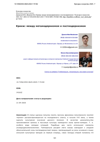 В статье сделана попытка понять причину феномена популярности понятия «кринж» распространившегося из молодежного сленга, в начале ХХI века, а также оценить культурное значение данного явления. В качестве доказательства проникновения кринжа в массовую культуру приводится жанр кринж-комедии. Т. е. особого рода комедии ситуаций. Подобные шоу часто используют элементы (псевдо)документалистики. Темпорально расцвет этого жанра совпадает с упадком объяснительной силы постмодернисткой теории, претендующей на роль основного языка описания культурных трендов (в первую очередь, стран Запада) второй половины ХХ века. Возникают многочисленные концепции, призванные отразить новейшие тенденции современности, которые отечественный философ А. Павлов объединяет под зонтичным термином «постпостмодернизм». Одним из самых известных и востребованных концептов подобного рода является «метамодернизм». Для анализа перемен в чувственности используется концепт Р. Уильямса “структура чувств”. Основные методы, которые были использованы в данном исследовании: контекстуальный, историко-генетический, компаративный, культурологический анализ. Новизна исследования заключается в том, возможно ли с помощью понятия “метамодернизм” концептуализировать сдвиги в чувственности, позволившие кринжу стать знаком нашего времени. Или же для описания перемен достаточно “устаревшего” понятия “постмодернизм”. Очевидно, что существует значительный запрос хотя бы на какую-то форму аутентичности и, одновременно, на связь с другими, даже если эта связь столь эфемерна, как общее для всех чувство неловкости. Однако авторы концепции “метамодернизм” лишь пунктирно обозначают связь изменений в чувственности с изменениями социально-экономических условий. Тезис Адама Коцко позволяет компенсировать данный недостаток, увязав перемены в чувственности с экономическим переходом от фордизма к постфордизму. Но перемены, произошедшие в структуре чувств, с неменьшим успехом могут быть объяснены и в рамках постмодернизма. Эти изменения являются развитием социальных и культурных трендов прошлого столетия. Поэтому выбор постмодернизма или метамодернизма в качестве инструмента определяется предпочтениями исследователя, а сам феномен кринжа и связанные с ним культурные явления вполне вписываются в рамки теории постмодернизма, что позволяет подчеркнуть преемственность между социально экономическими основаниями и их репрезентацией в культуре.