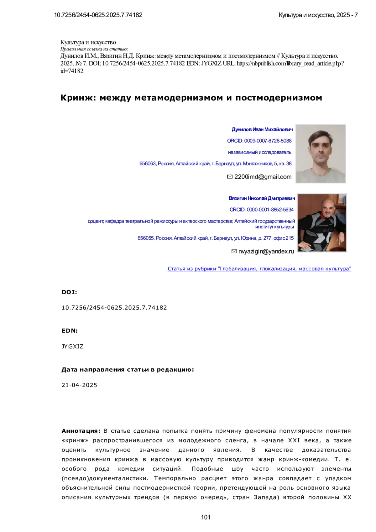 14. Лобанова Ю. В., Хереш Е. И. Жанр кринж-комедии как свидетельство рождения нового модуса стыда // Вестник МГУКИ. 2022. № 3 (107). С. 53-61. DOI: 10.24412/1997-0803-2022-3107-53-61.