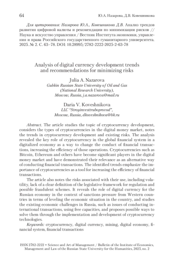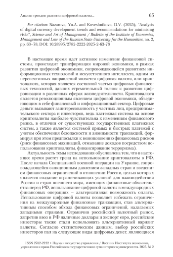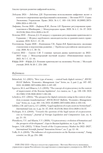 3. Лебедева 2024 - Лебедева Д.В. Перспективы использования цифровых валют в контексте современных преобразований в экономике // Вестник РГГУ. Серия: Экономика. Управление. Право. 2024. № 4. С. 103-116. https://doi.org/10.28995/2073-6304-2024-4-103-116.