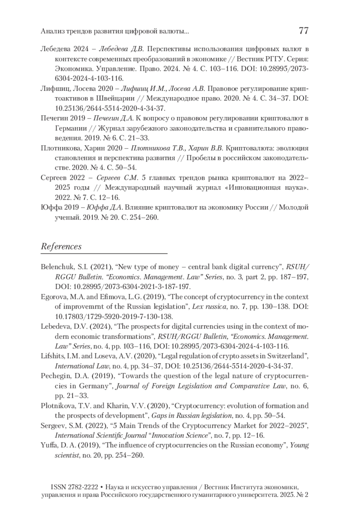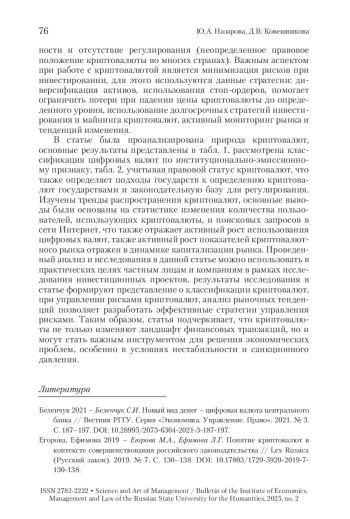 2. Егорова, Ефимова 2019 - Егорова М.А., Ефимова Л.Г. Понятие криптовалют в контексте совершенствования российского законодательства // Lex Russica (Русский закон). 2019. № 7. С. 130-138. https://doi.org/10.17803/1729-5920-2019-7-130-138.