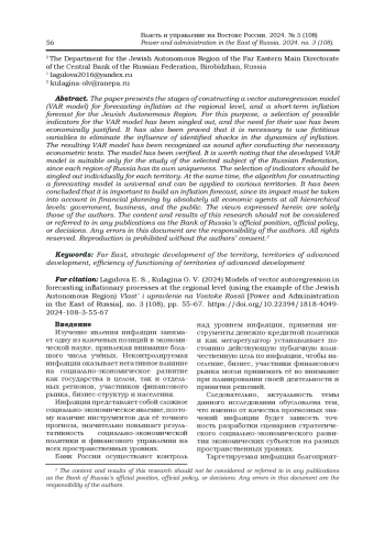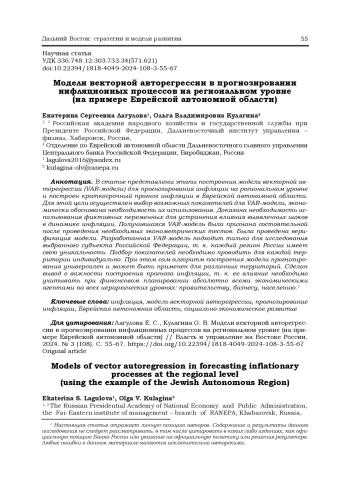 ЛАГУЛОВА Е. С., КУЛАГИНА О. В. МОДЕЛИ ВЕКТОРНОЙ АВТОРЕГРЕССИИ В ПРОГНОЗИРОВАНИИ ИНФЛЯЦИОННЫХ ПРОЦЕССОВ НА РЕГИОНАЛЬНОМ УРОВНЕ (НА ПРИМЕРЕ ЕВРЕЙСКОЙ АВТОНОМНОЙ ОБЛАСТИ) // ВЛАСТЬ И УПРАВЛЕНИЕ НА ВОСТОКЕ РОССИИ. 2024. № 3 (108)
